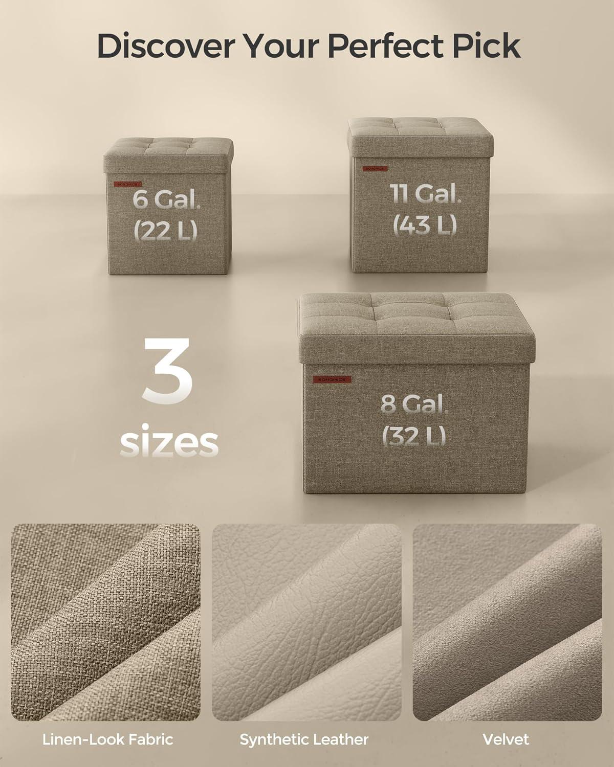 [Plenty of Storage Space] This folding ottoman, sized 11.8”D x 11.8”W x 11.8”H (30 x 30 x 30 cm) with a total capacity of 6 gallons, can be used to neatly organize your bed sheets, pillows, blankets, magazines, and more