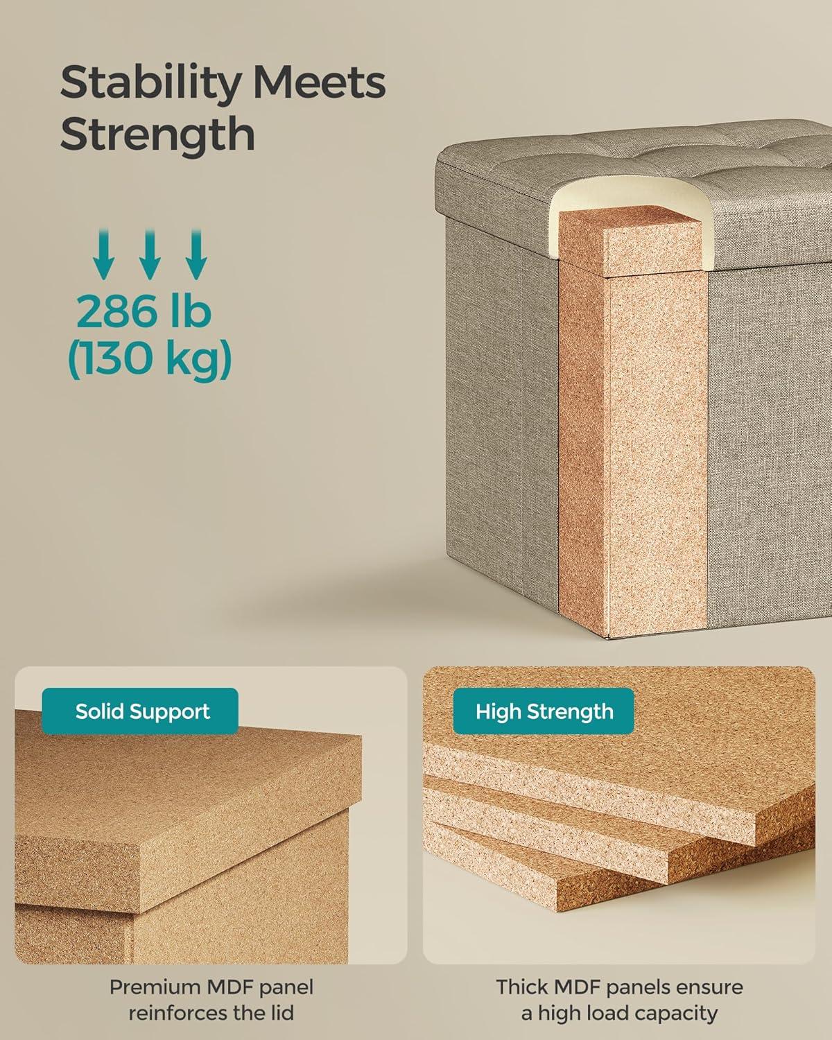 [Stylish and Sturdy] This storage ottoman features stylish linen-look fabric with fine stitching. Metal corner guards help reinforce the lid and thick MDF boards support the tops and sides, allowing the ottoman to hold a static load capacity of 286.6 lb