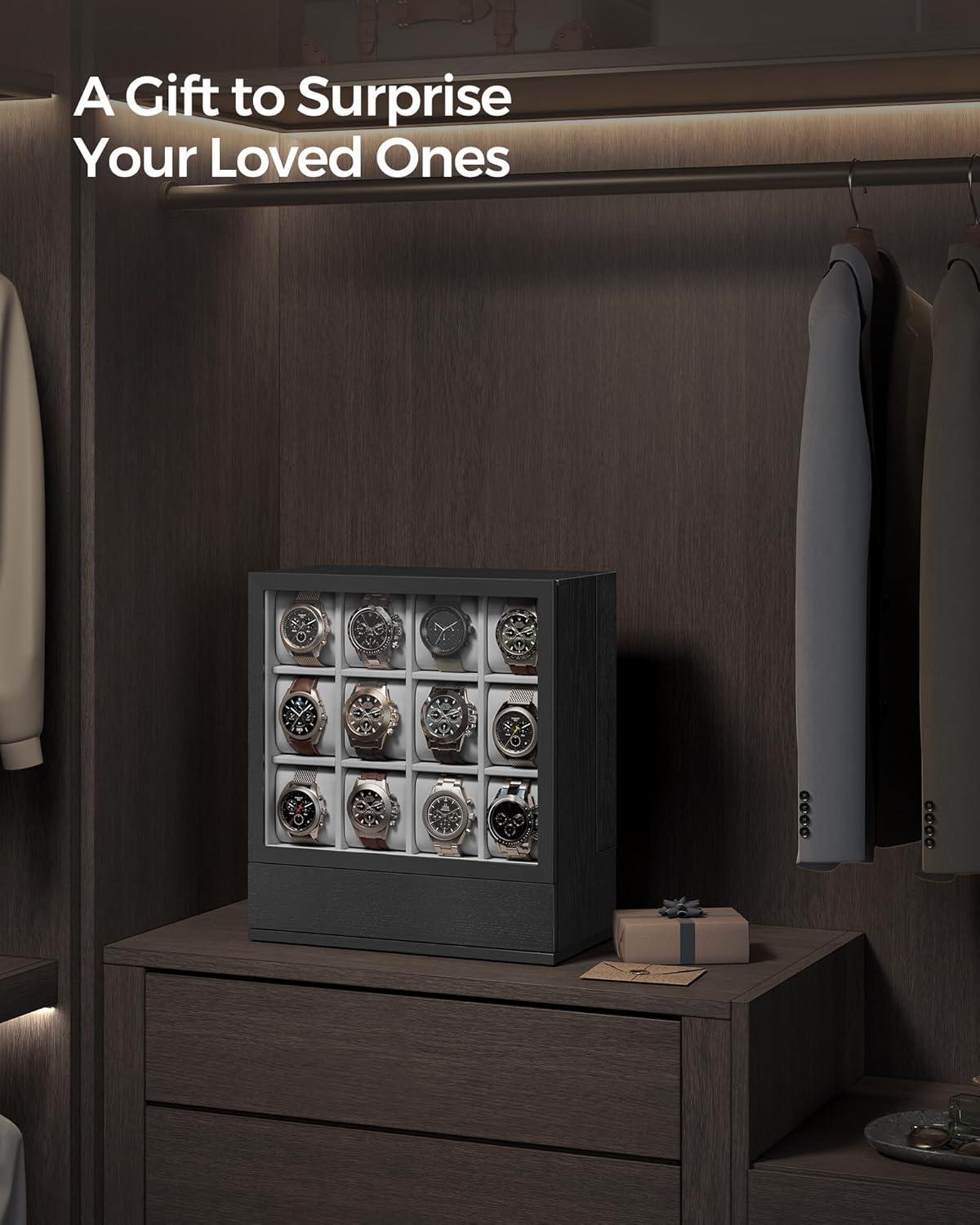 imageSONGMICS 12Slot Watch Box Watch Display Case with Window Solid Wood Veneer Velvet Lining Vertical Storage Space Saving Gift Idea Coffee Brown UJOW014K01Ebony Black