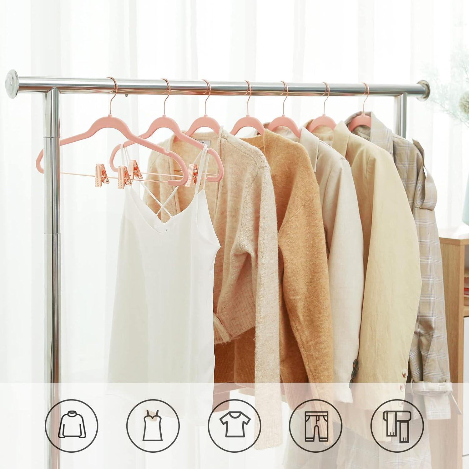 WHAT YOU GET: 24 premium velvet hangers that give your beloved clothes great protection, adjustable clips with non-slip pads to fit your different clothing, and 360° swivel hooks for easy use
