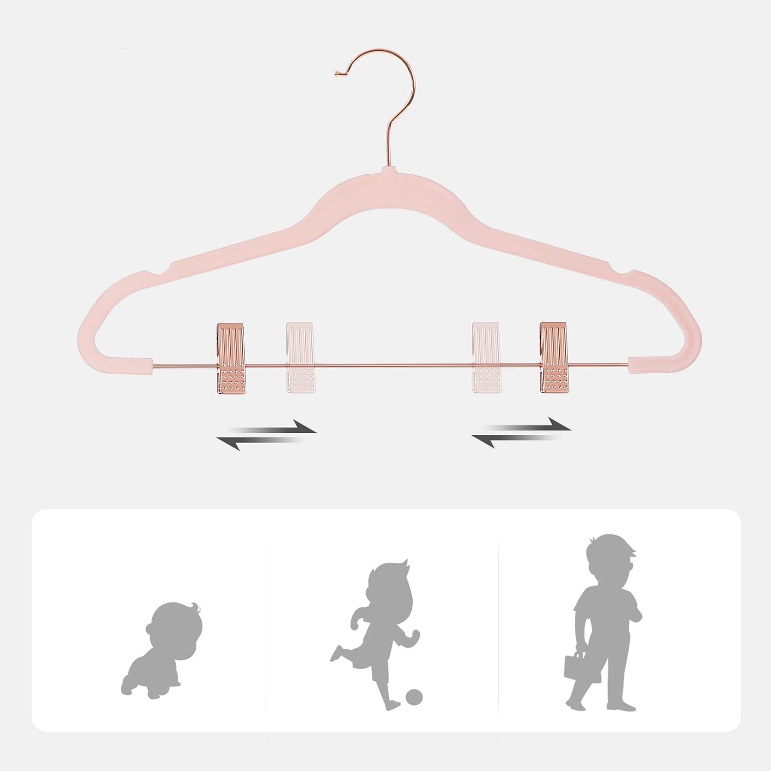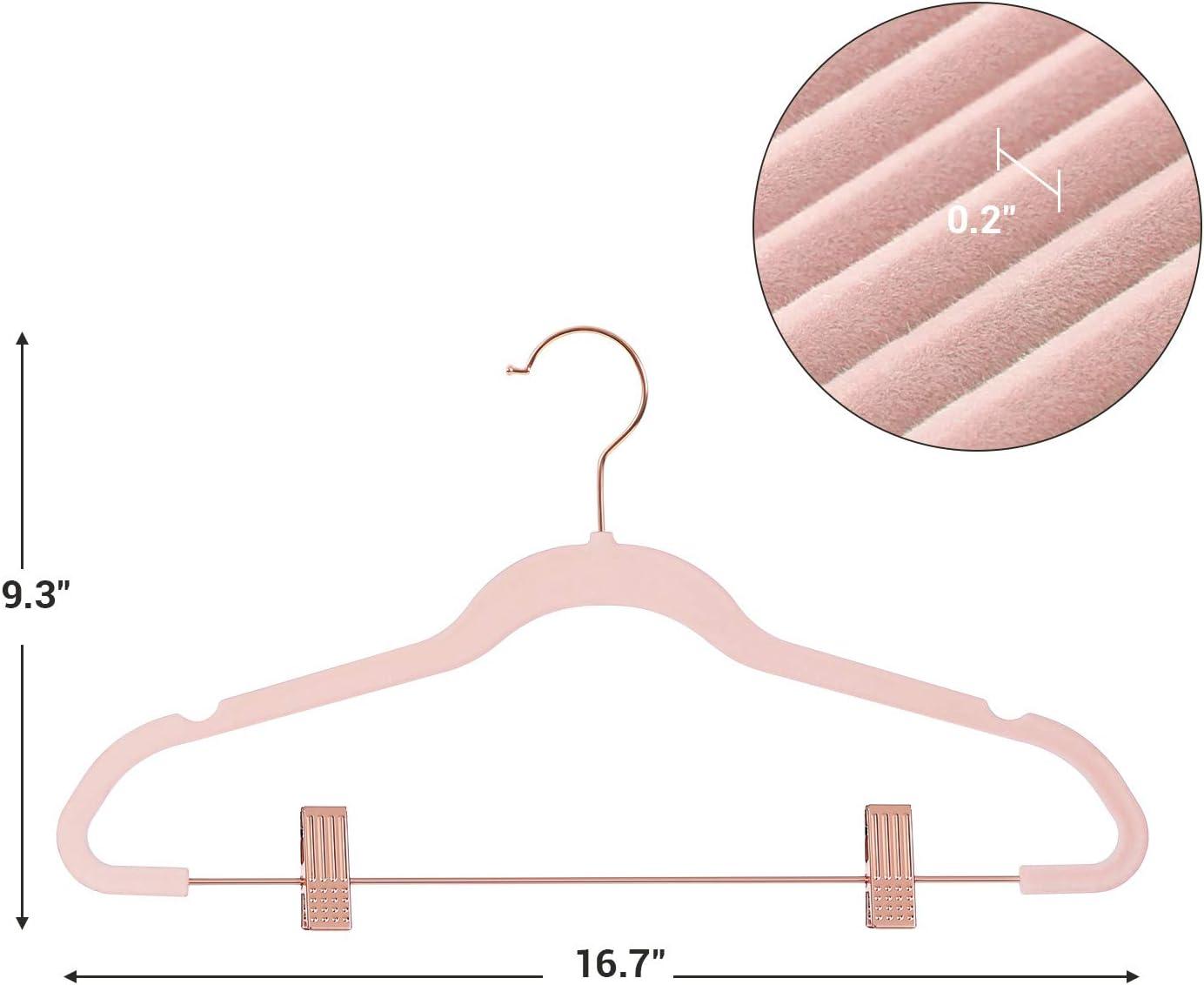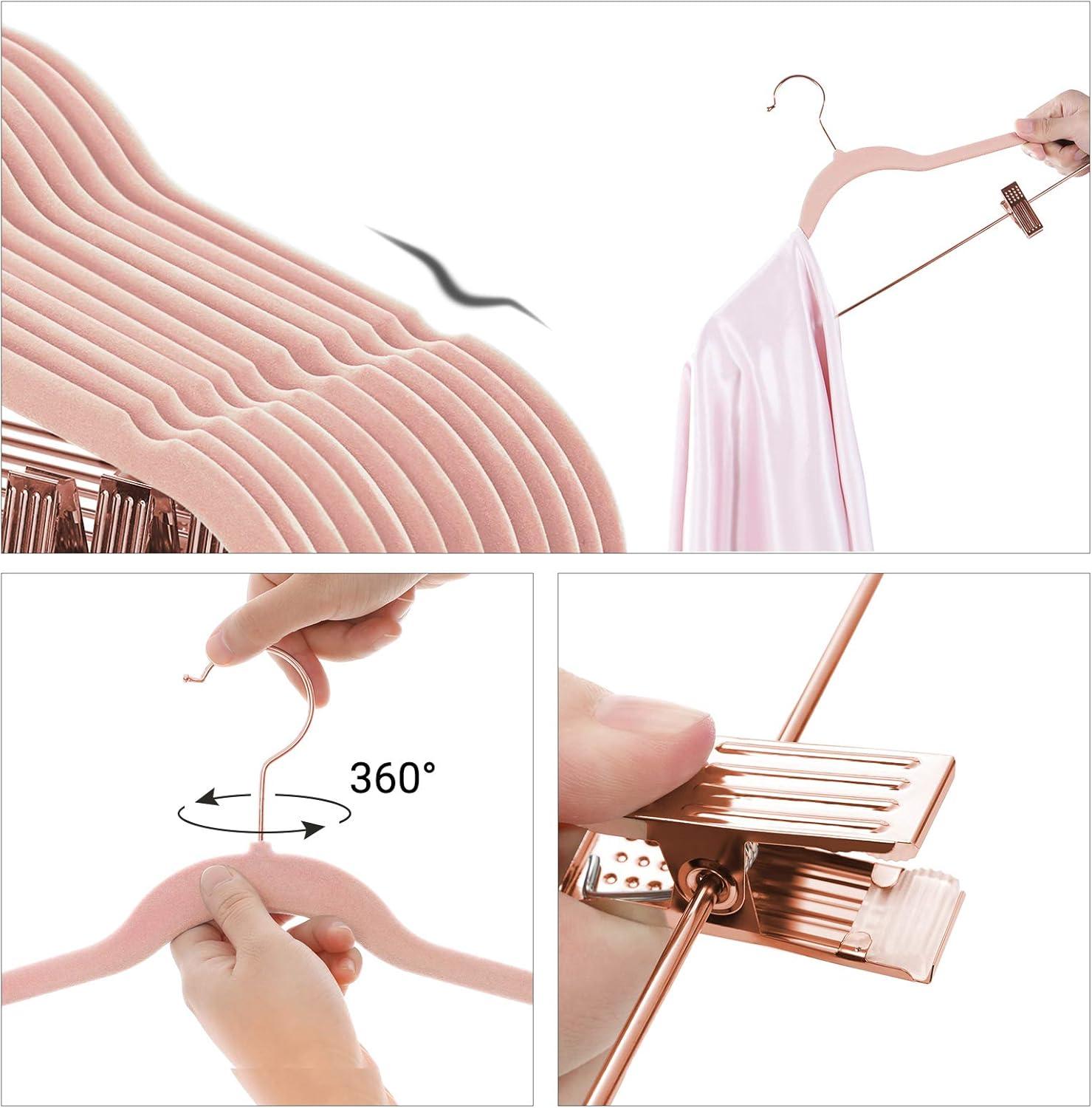 ADD SPARKLE TO YOUR CLOSET: Rose gold colored hook, metal bar, and clips spice up these velvet clothes hangers, adding a bit of sparkle to your closet while keeping your clothes in tip-top shape