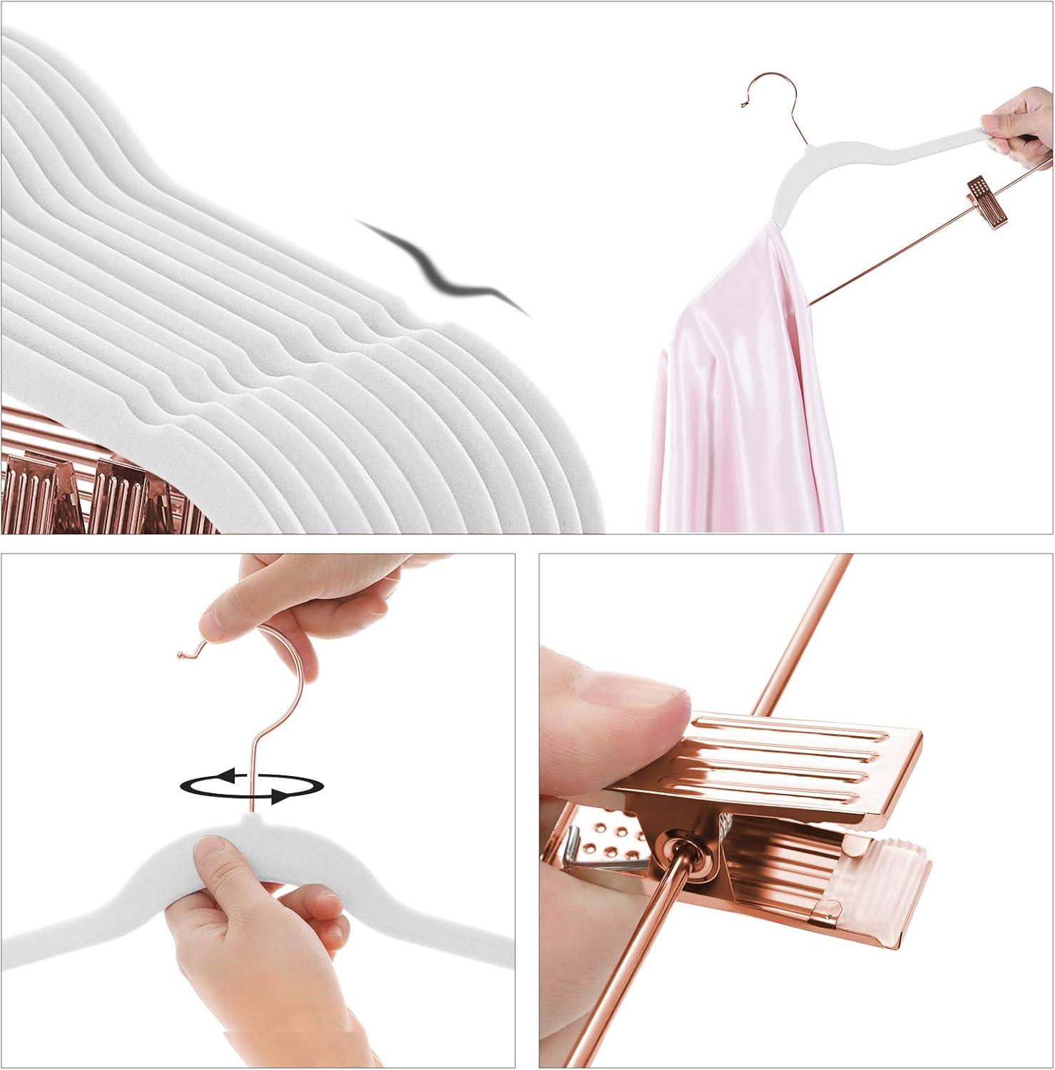 WHAT YOU GET: 24 premium velvet hangers that give your beloved clothes great protection, adjustable clips with non-slip pads to fit your different clothing, and 360° swivel hooks for easy use