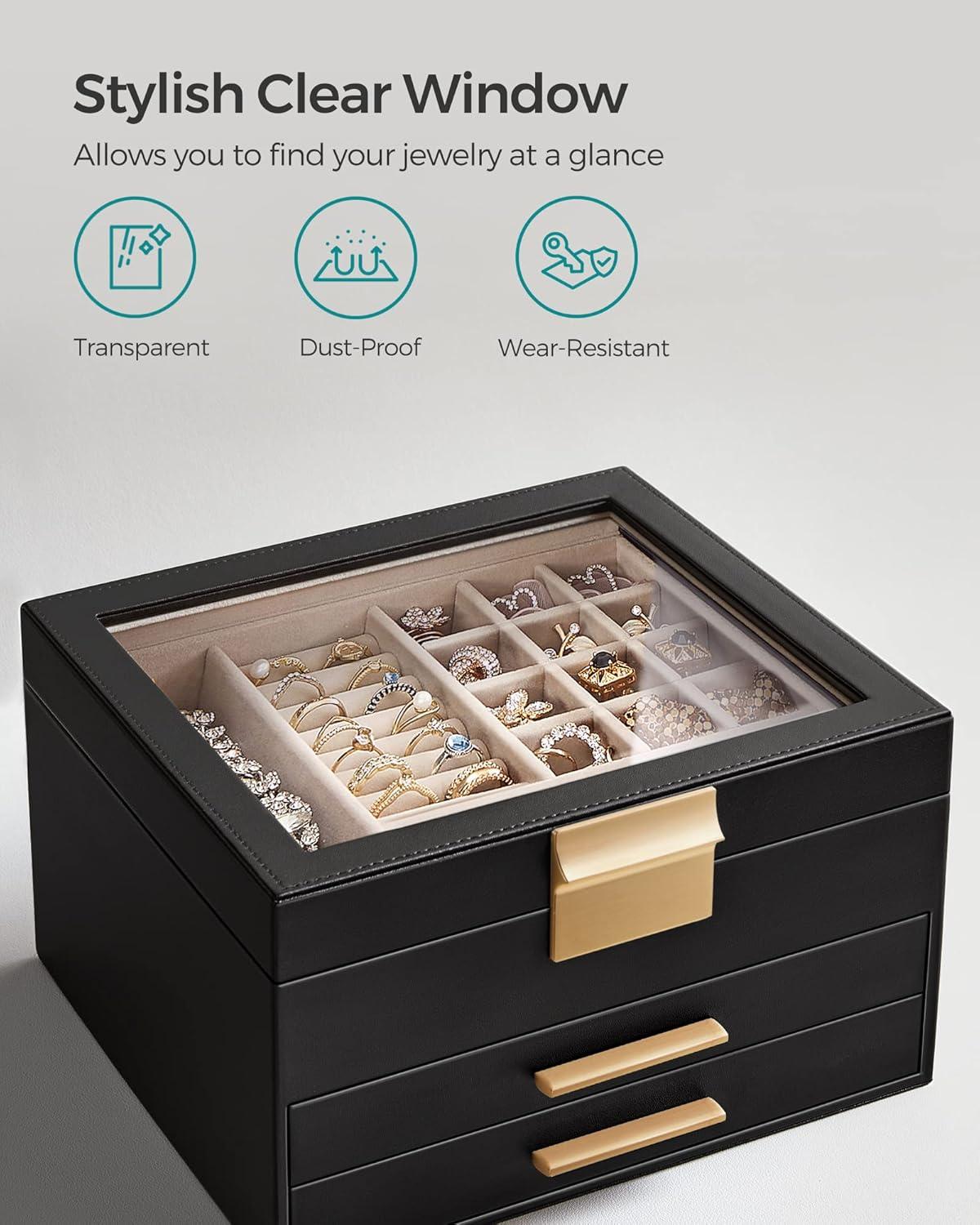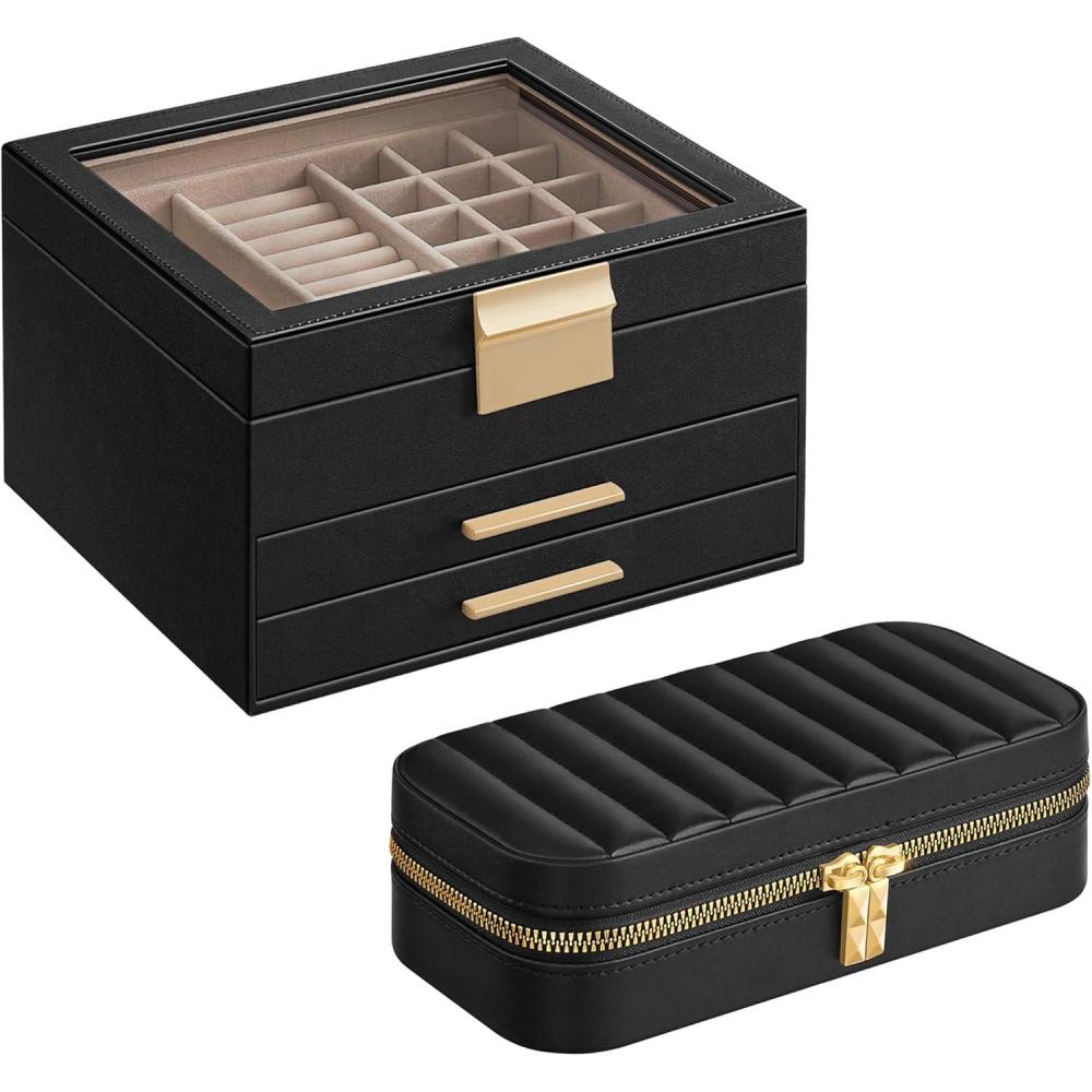 【BUNDLE PACK INCLUDES】A 3-tier jewelry organizer with a glass lid and 2 drawers from SONGMICS and a rectangular travel jewelry box with a built-in mirror from SONGMICS HOME ANAH Collection