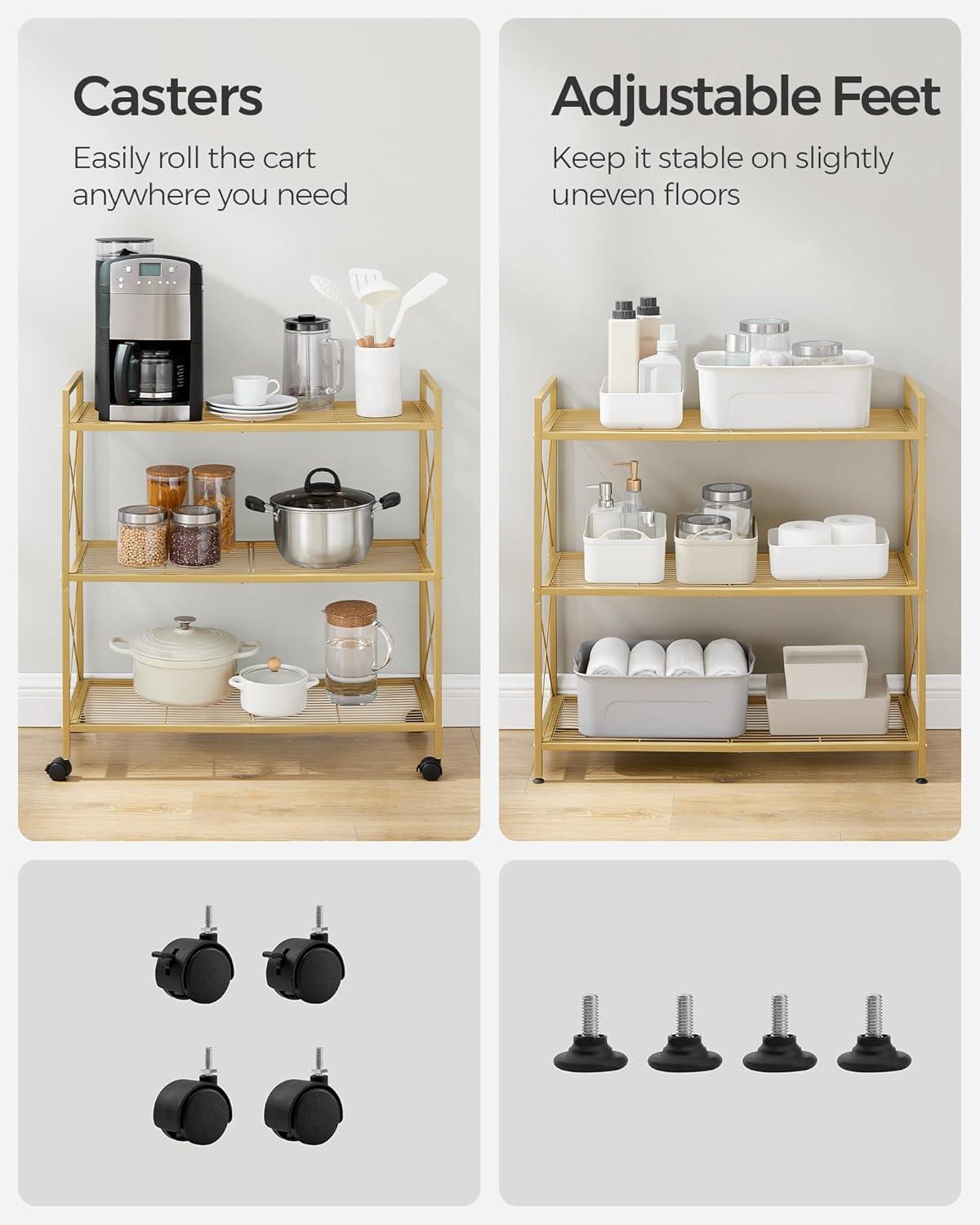 [With Casters or Adjustable Feet?] It’s up to you! You may choose to install casters to roll this 3-tier shoe rack anywhere you need easily, or install the adjustable feet to keep it balanced on slightly uneven floors