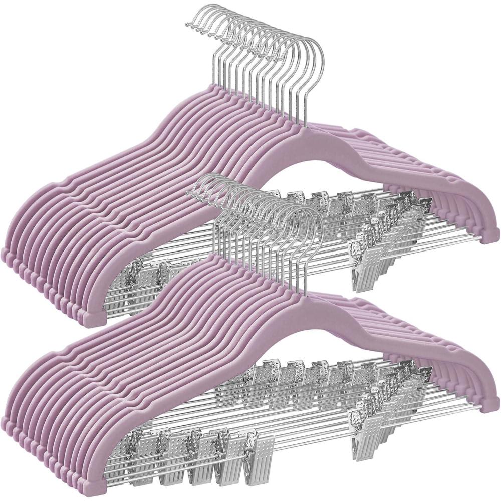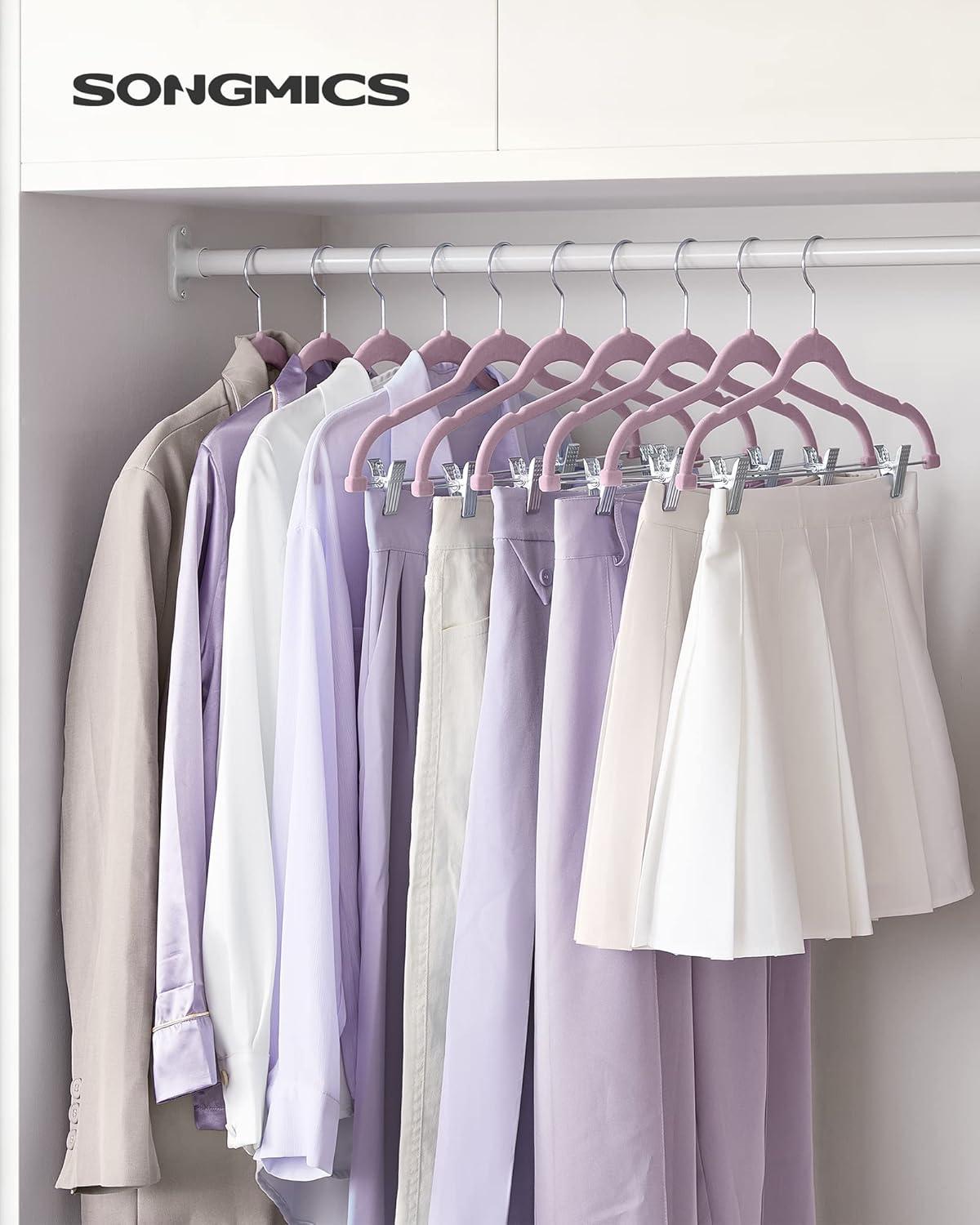 SONGMICS 30 Pack Pants Hangers, 16.7 Inches Long Velvet Trousers Hangers with Adjustable Clips, Heavy-Duty, Non-Slip, Space-Saving for Pants, Skirts, Coats, Dresses, Tank Tops, Black UCRF12B30(Pale Purple)
