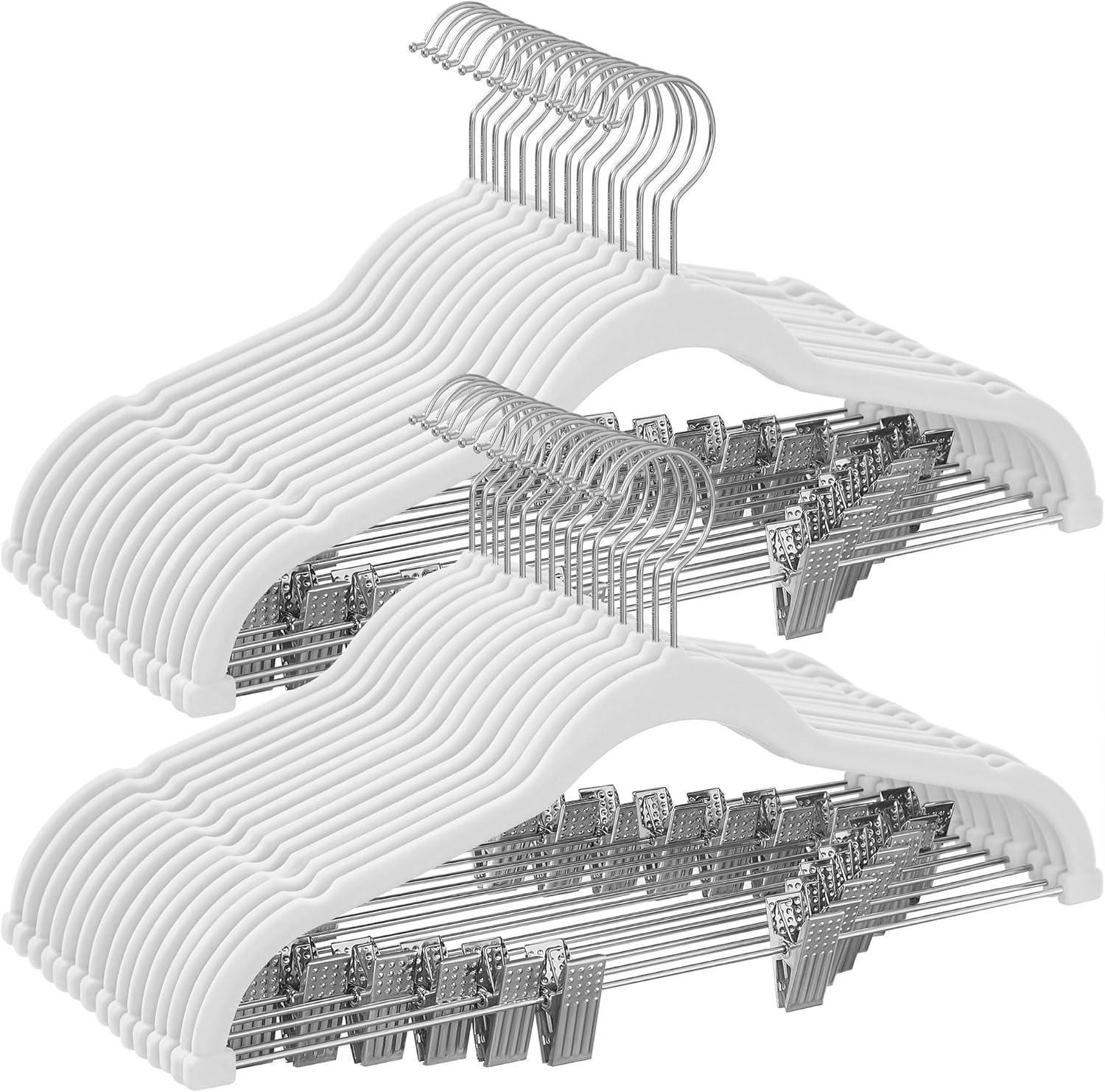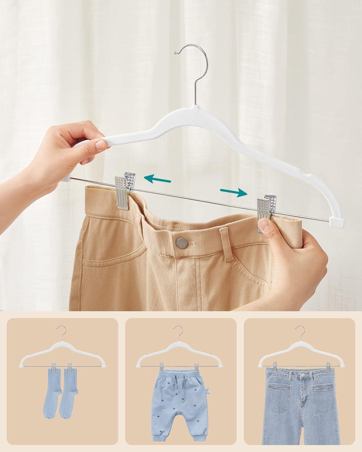 SONGMICS 30 Pack Pants Hangers, 16.7 Inches Long Velvet Trousers Hangers with Adjustable Clips, Heavy-Duty, Non-Slip, Space-Saving for Pants, Skirts, Coats, Dresses, Tank Tops, Black UCRF12B30(White)