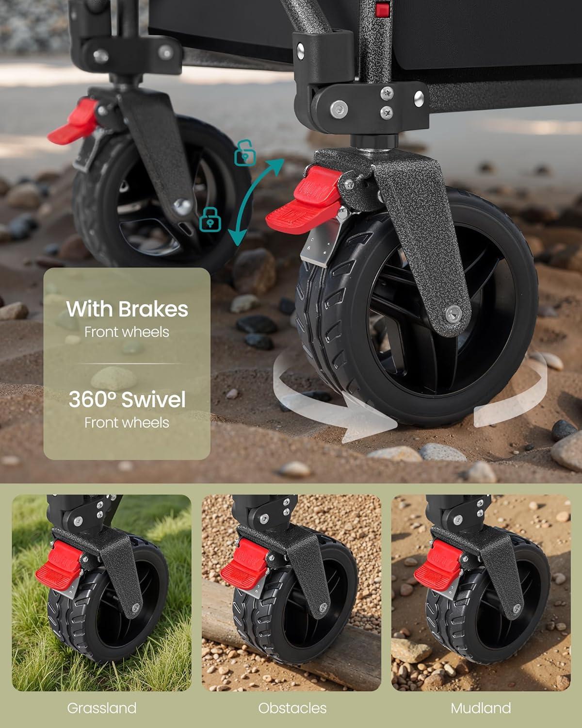 【WHEELS – MOVABLE, LOCKABLE, REMOVABLE】This camping wagon is equipped with 4 wide wheels. The 2 front wheels are swivel ones with brakes, ensuring both mobility and stability. Plus, all wheels are removable for easy cleaning