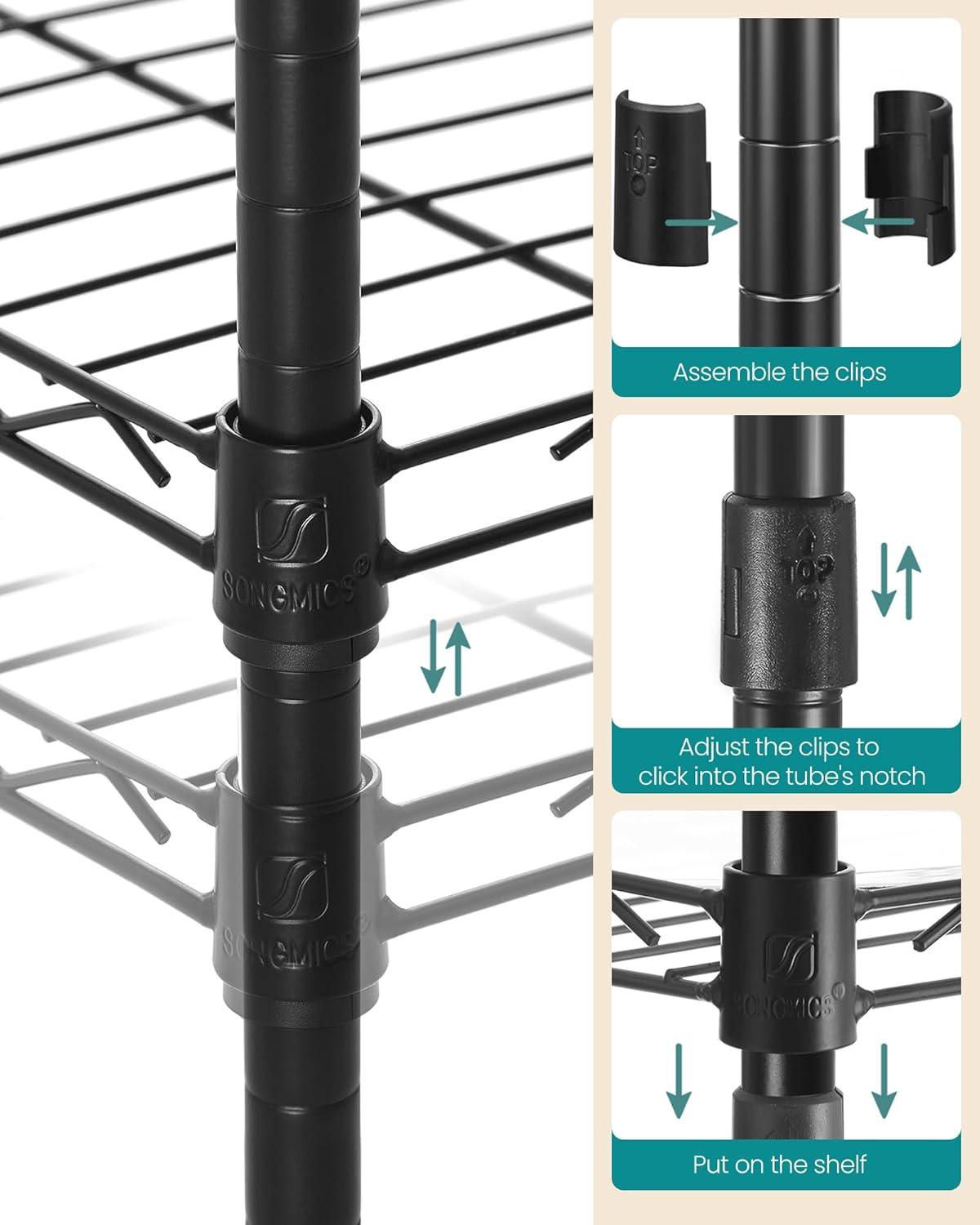 [Adjustable Height, Extendable Design] Each shelf is height-adjustable to help maximize the space. Also, you can extend the rack infinitely with more metal shelves—at least until it reaches the limits of your walls
