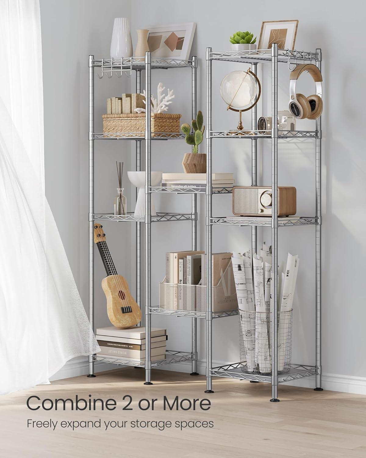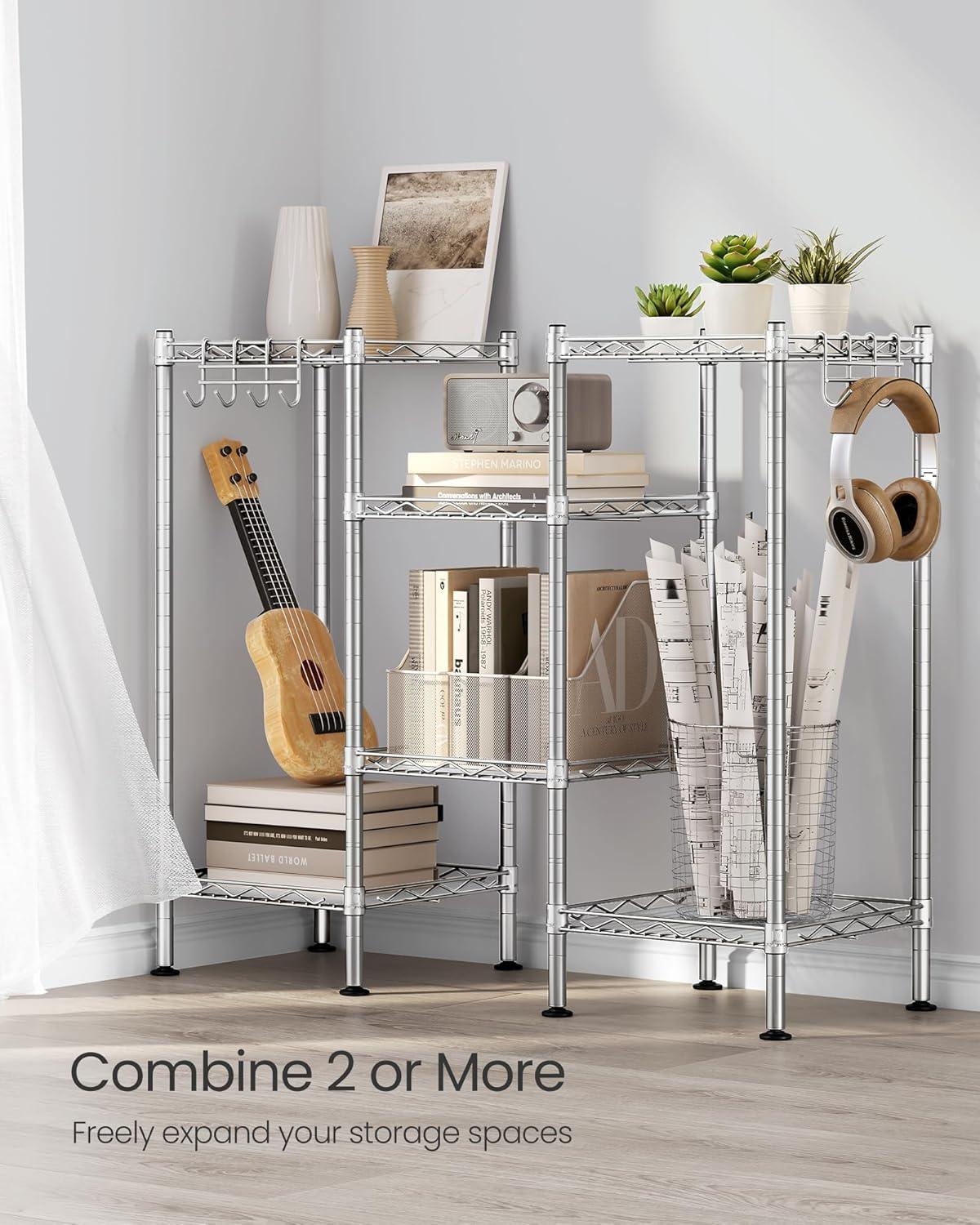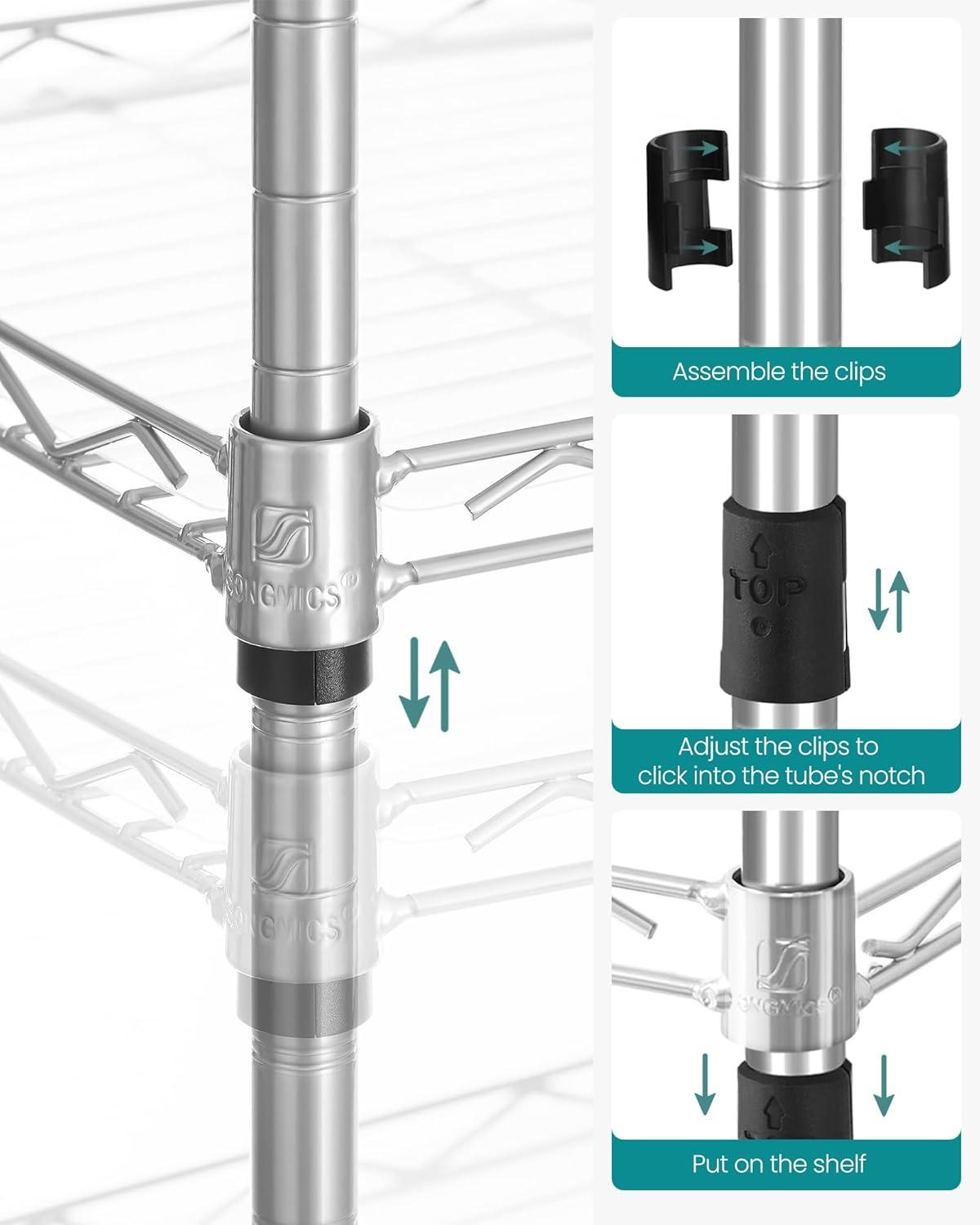[Adjustable Height, Extendable Design] Each shelf is height-adjustable to help maximize the space. Also, you can extend the rack infinitely with more metal shelves—at least until it reaches the limits of your walls