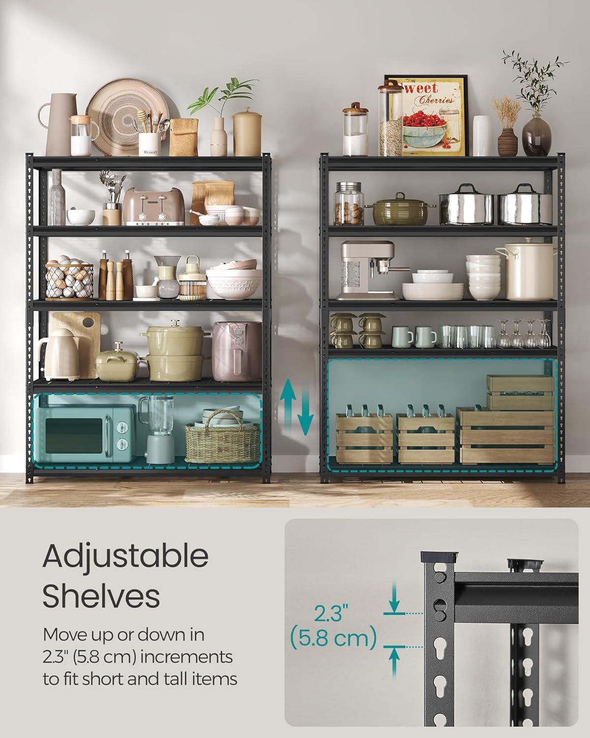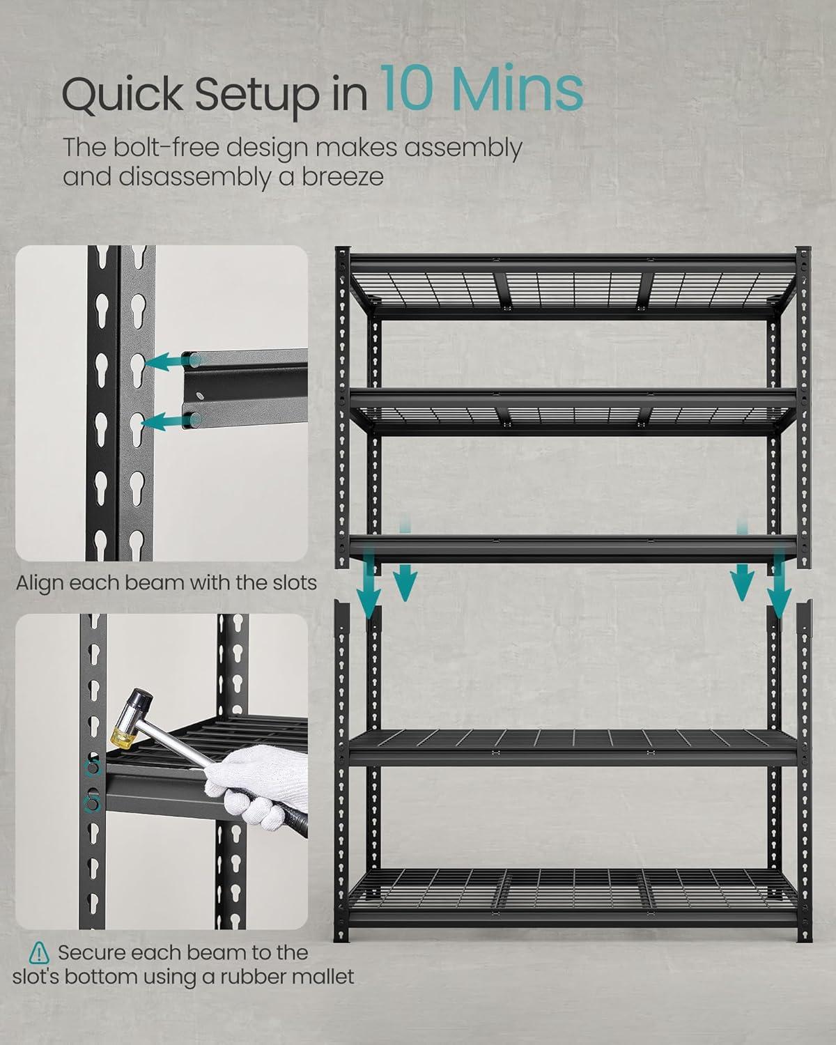 【HEAVY-DUTY】This robust 5-tier shelving unit can hold up to 440 lb per shelf, totaling 2,200 lb. Feel free to store heavy items in your garage, warehouse, or basement with confidence, from tools and equipment to boxes and supplies