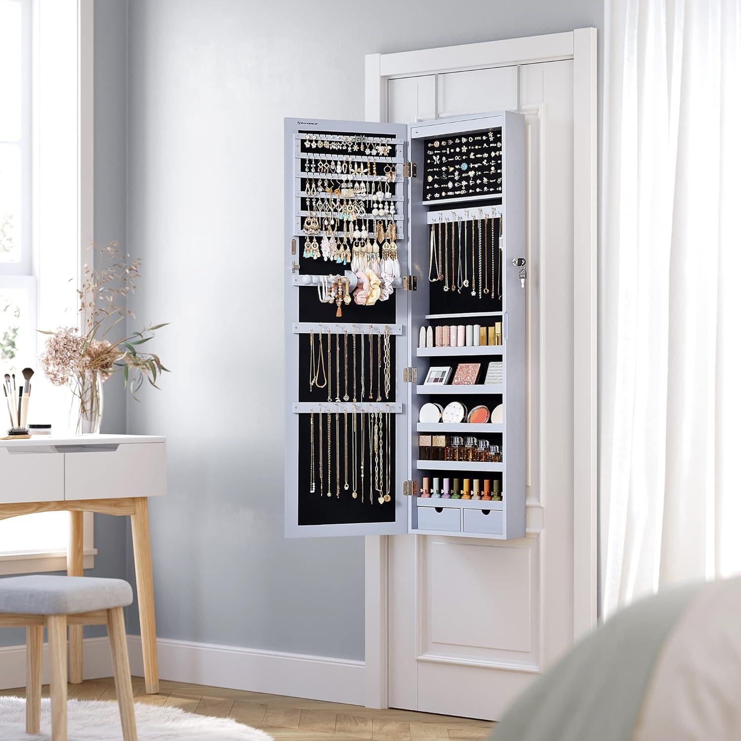 SONGMICS 6 LEDs Mirror Jewelry Cabinet, 47.2-Inch Tall Lockable Wall or Door Mounted Jewelry Armoire Organizer with Mirror, 2 Drawers, 3.9 x 14.6 x 47.2 Inches, White UJJC93W(Gray)