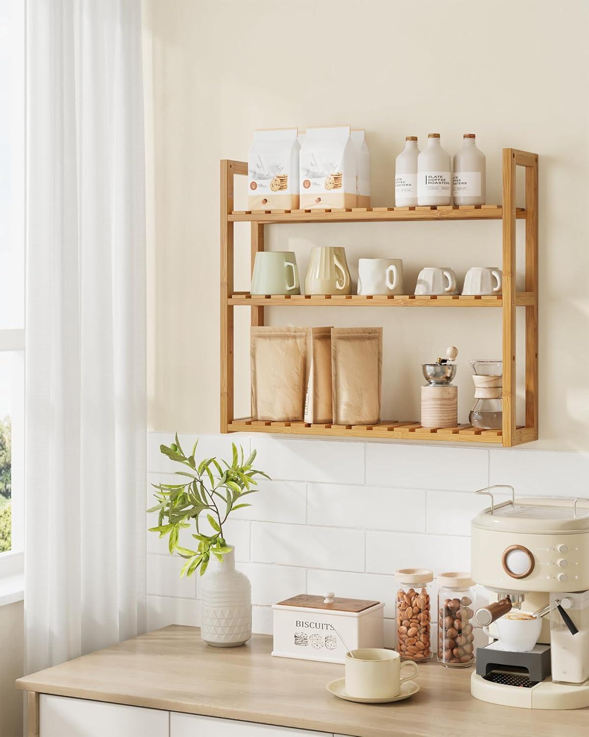 SONGMICS Bamboo Bathroom Shelf, 3-Tier Adjustable Plants Rack, Wall-Mounted or Stand, in The Living Room, Balcony, Kitchen, 5.9 x 23.6 x 21.3 Inches, Natural and Cloud White UBCB13WN(Natural)