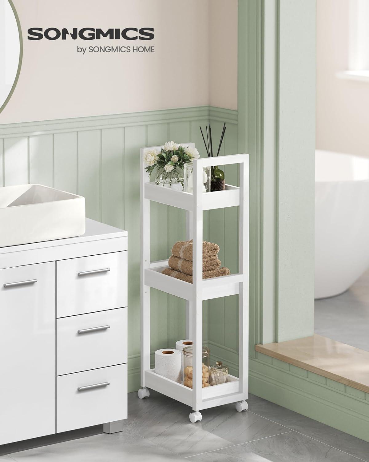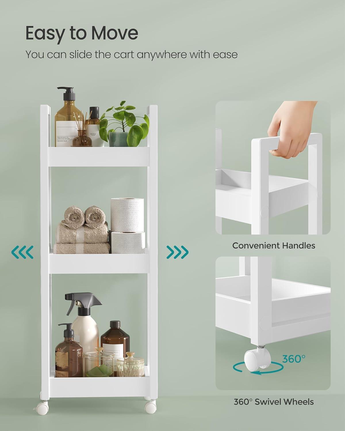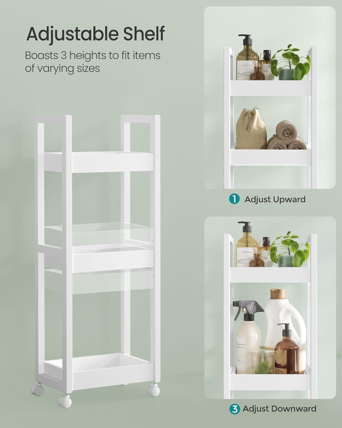 【ADAPTABLE SHELVING】The middle shelf of this mobile storage cart offers 3 adjustable heights. This feature encourages you to organize items of different sizes, helping your large shampoo or detergent bottles find their perfect place