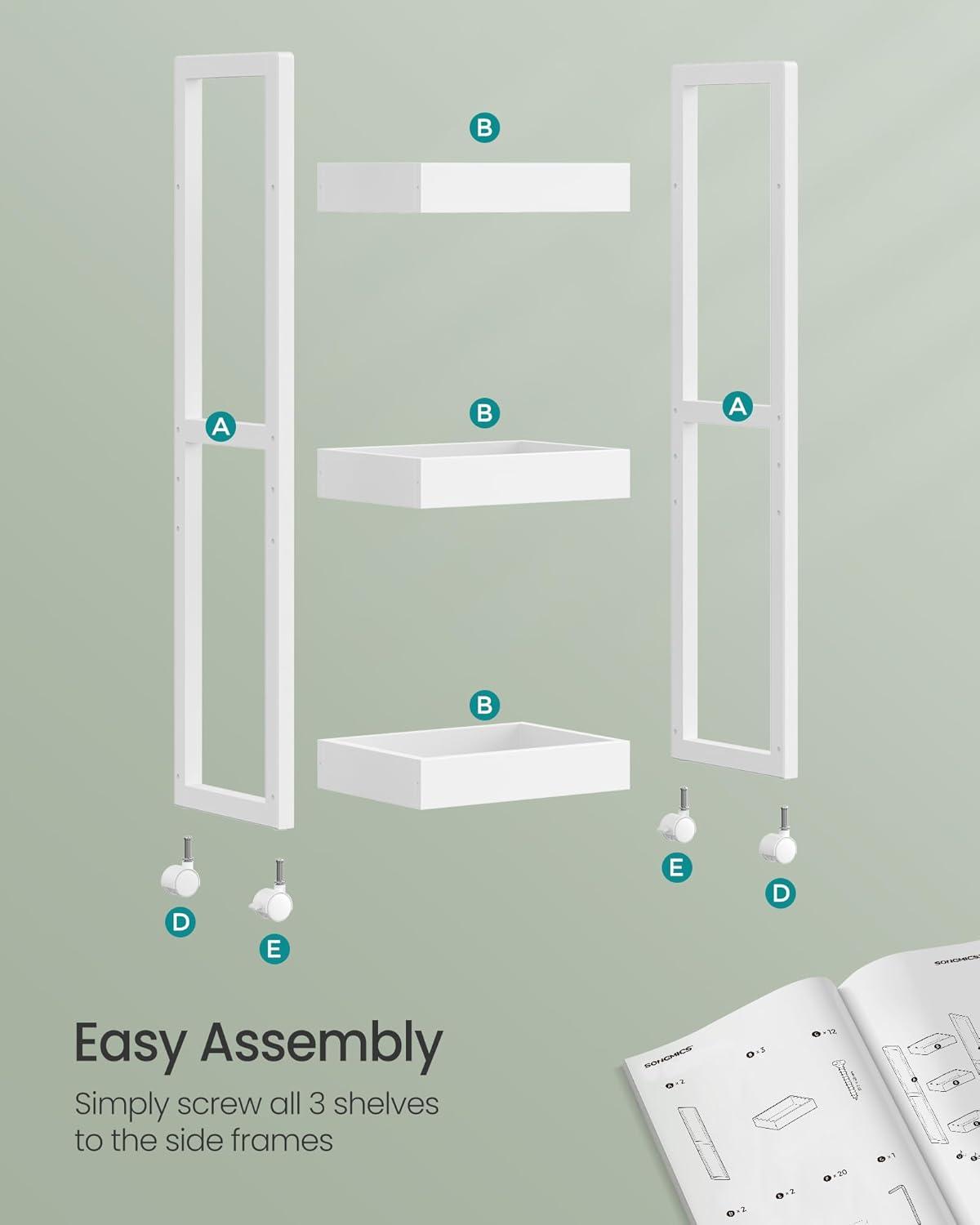 【HASSLE-FREE ASSEMBLY】Setting up this storage shelf on wheels is a breeze. Just attach the 3 shelves to the side frames with a few screws, and it's ready for use