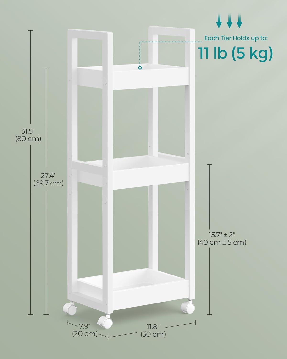 【MAXIMIZE SMALL SPACES】This 7.9″D x 11.8″W x 31.5″H rolling cart features a small figure that takes up little floor space, so you can place it next to the sink to turn the narrow spaces to functional storage