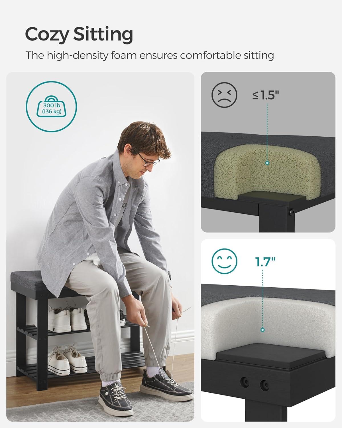 Sit Comfortably: Forget about the hard, stone-like stools and try this comfortable shoe bench! It comes with 1.7″ thick padding to ensure enjoyable sitting while you change shoes
