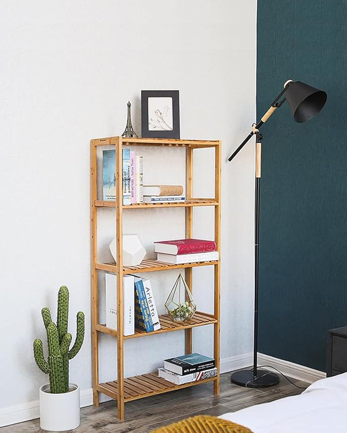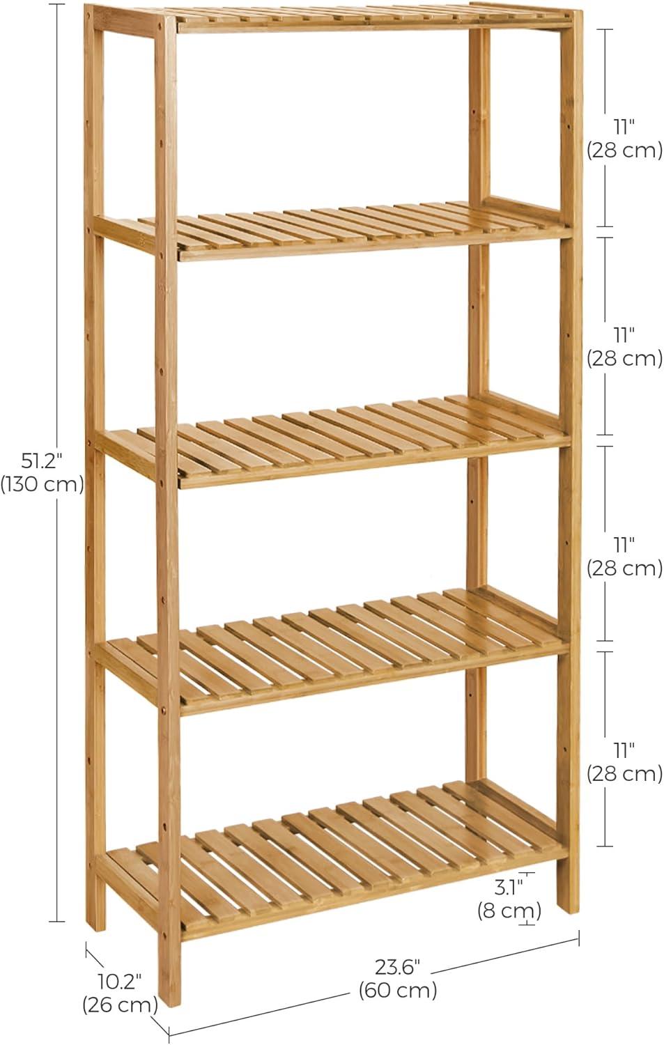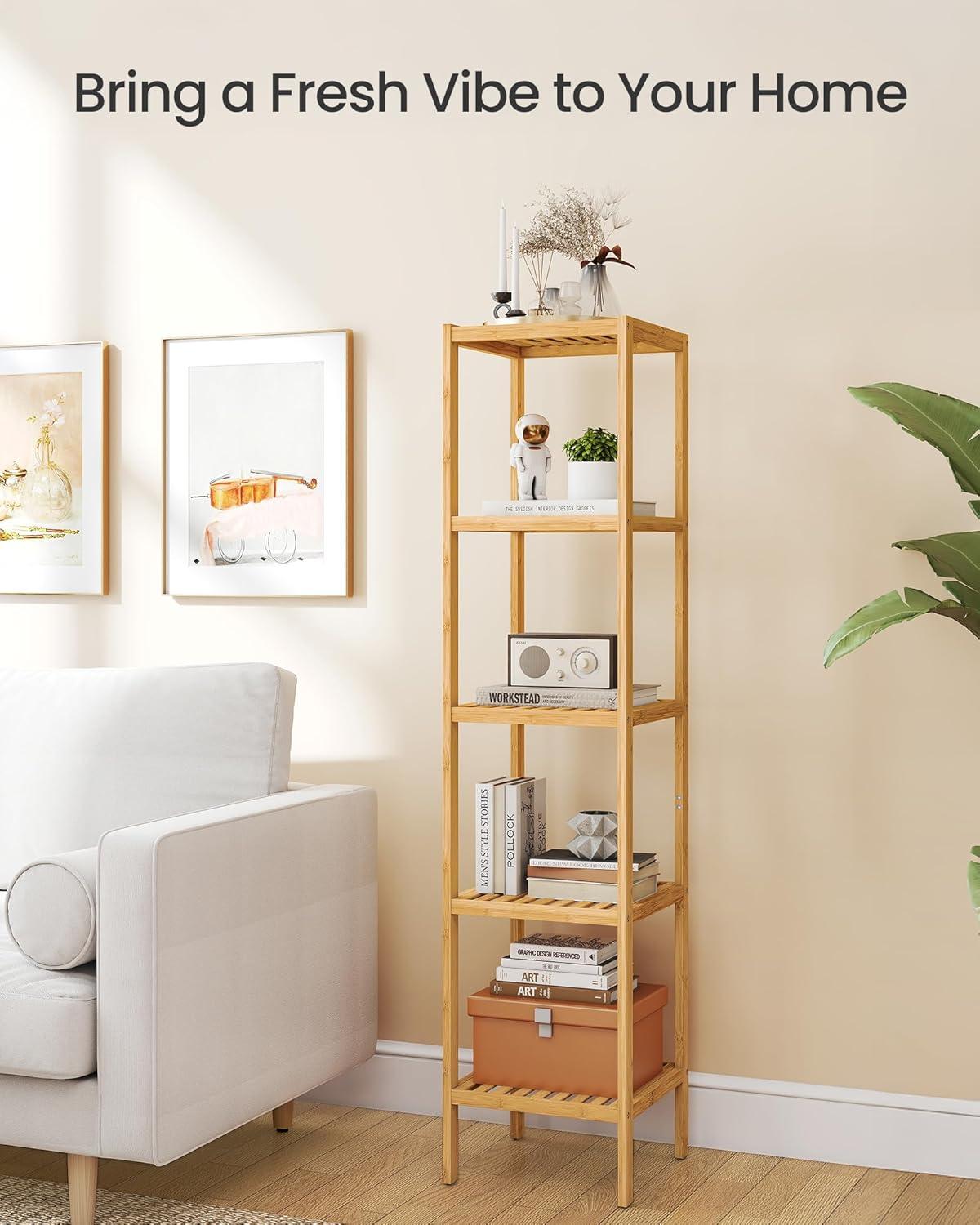 Space-Saving: Measuring 13″D x 13″W x 57.5″H, this bamboo shelf occupies a small footprint yet offers ample vertical storage, making it the perfect choice for small spaces