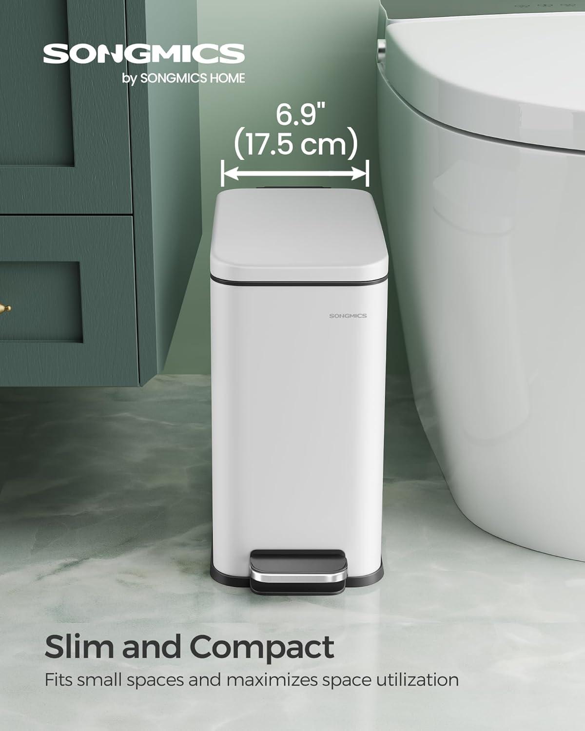 [Space-Efficient Solution] With a slim profile measuring 11.8”L x 5.6”W x 11.4”H, this 1.3-gallon bathroom trash can snugly fit small spaces, offering ample capacity while occupying minimal floor space