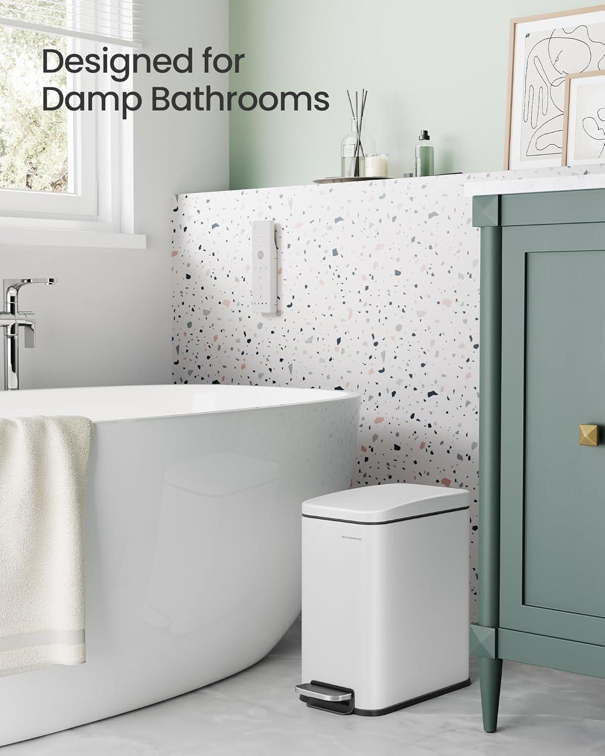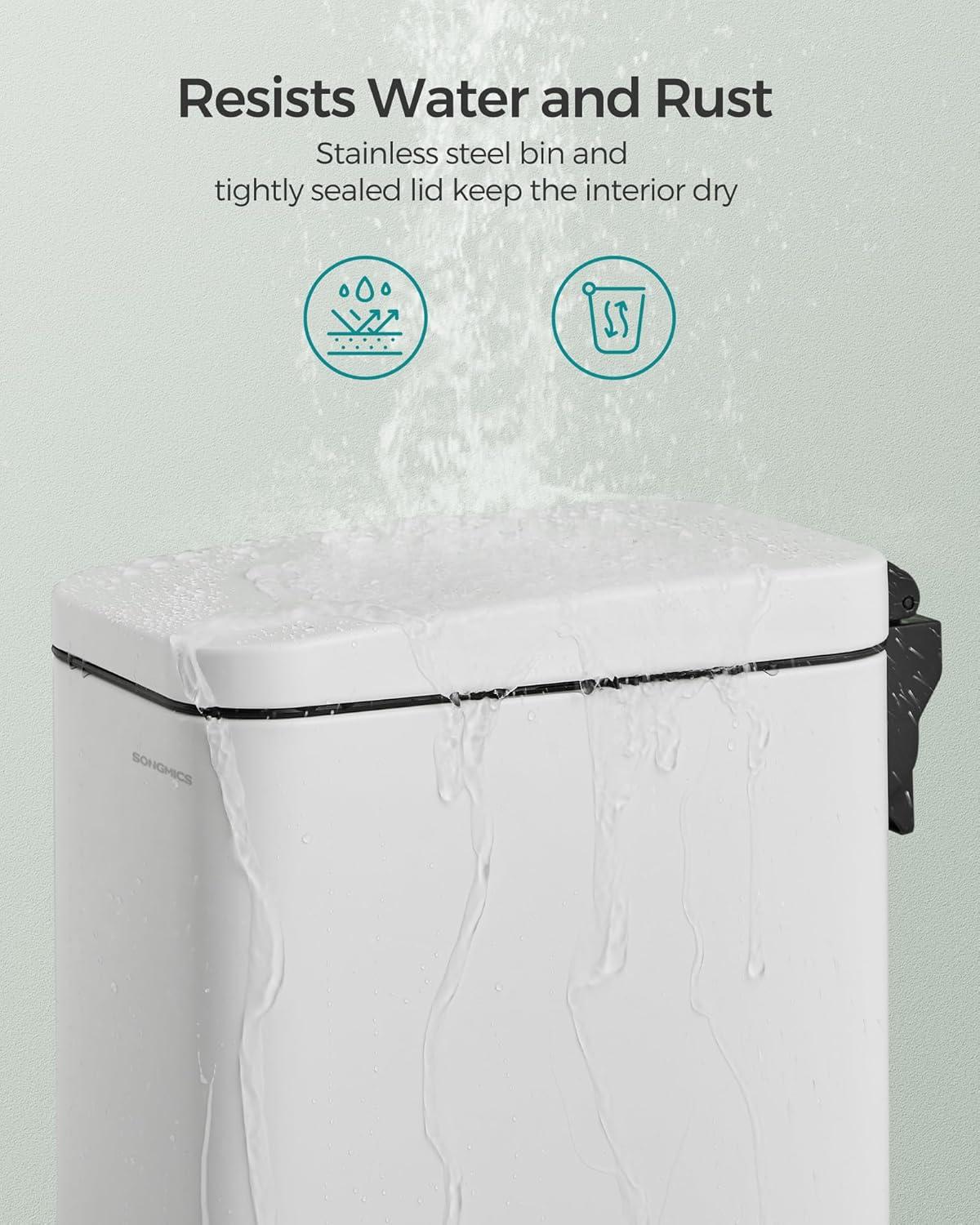 [Perfect for Damp Bathrooms] Featuring a stainless steel bin and a tightly sealed lid, this small trash can is resistant to rust and water, ensuring a dry interior that’s perfect for use in damp bathrooms