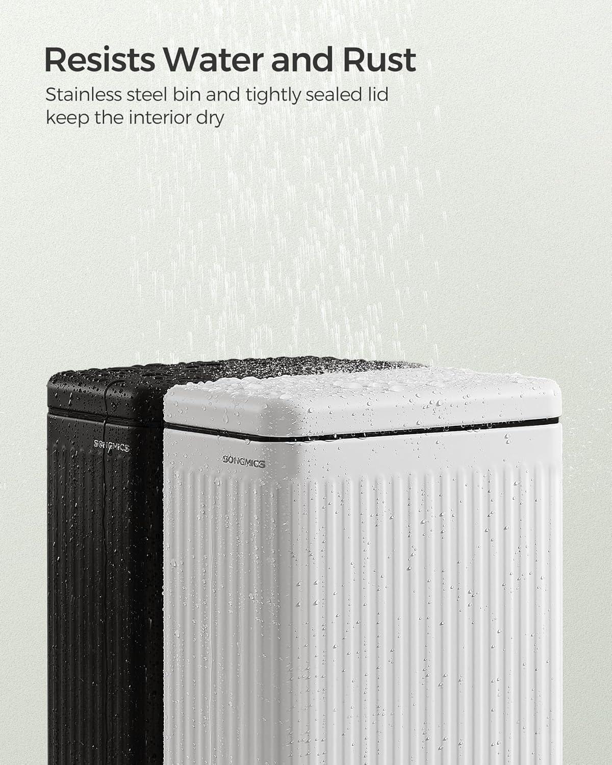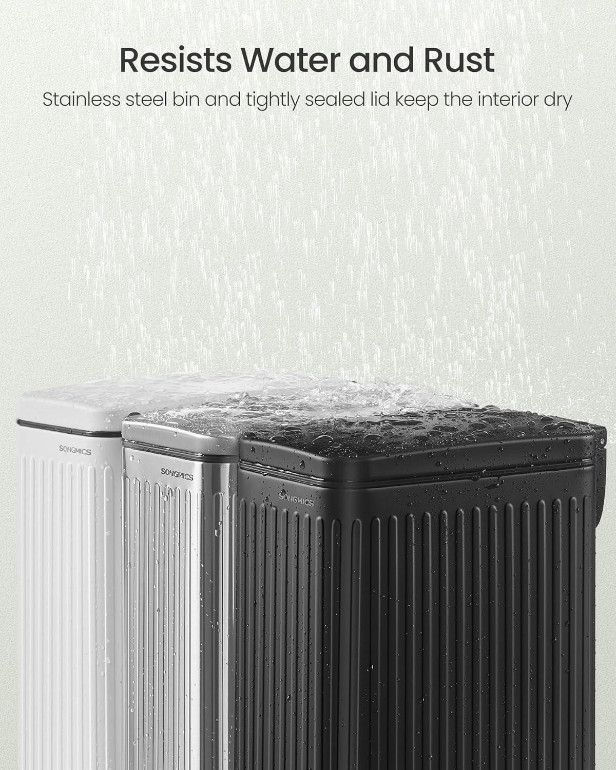 【PERFECT FOR DAMP BATHROOMS】Featuring a stainless steel bin and a tightly sealed lid, this small trash can is resistant to rust and water, ensuring a dry interior that’s perfect for use in damp bathrooms