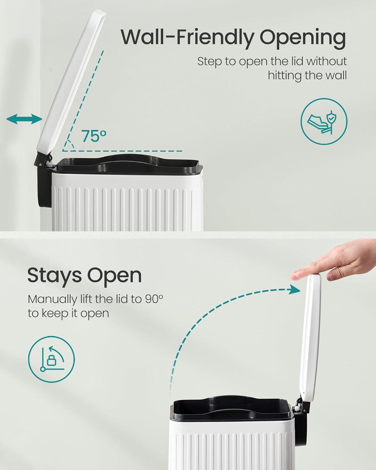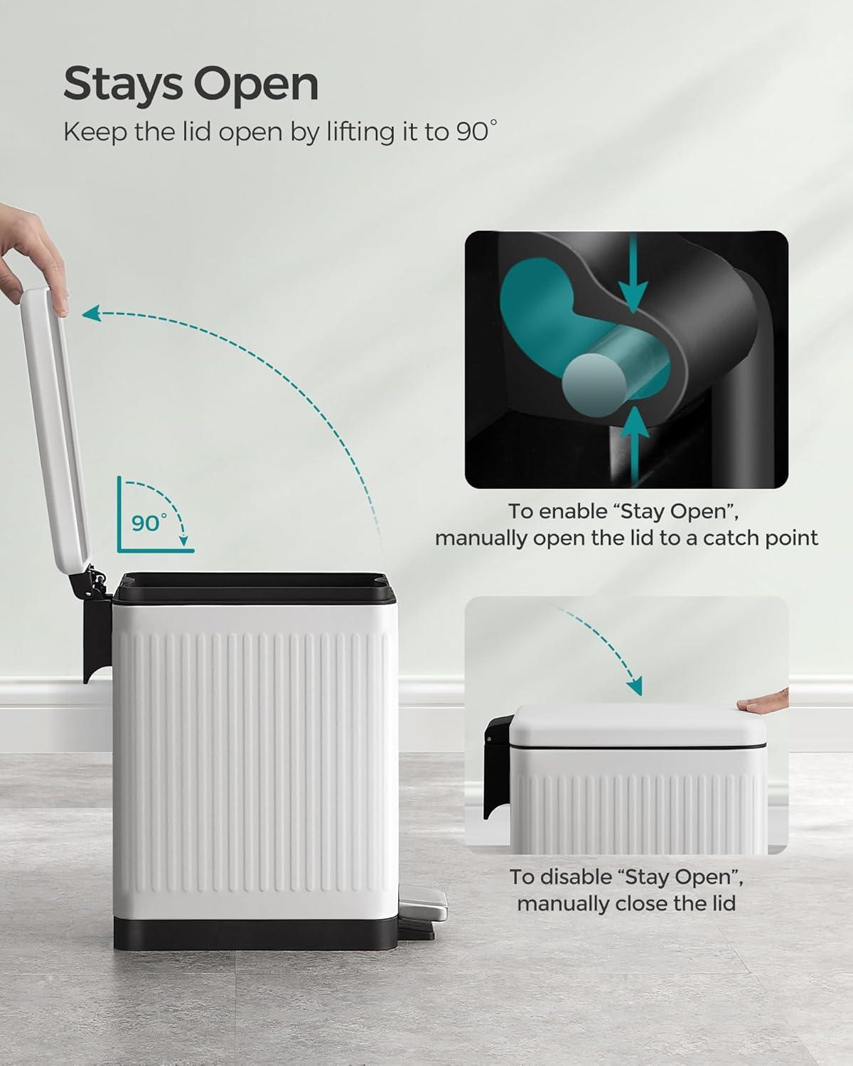 【SOFT-CLOSE & STAY-OPEN】This trash bin features a lid that closes quietly and gently without slamming shut. Additionally, you can keep the lid open for easy waste disposal when needed