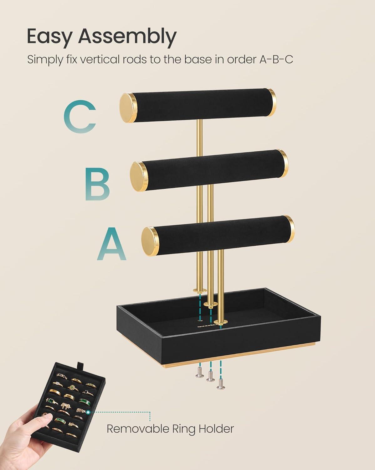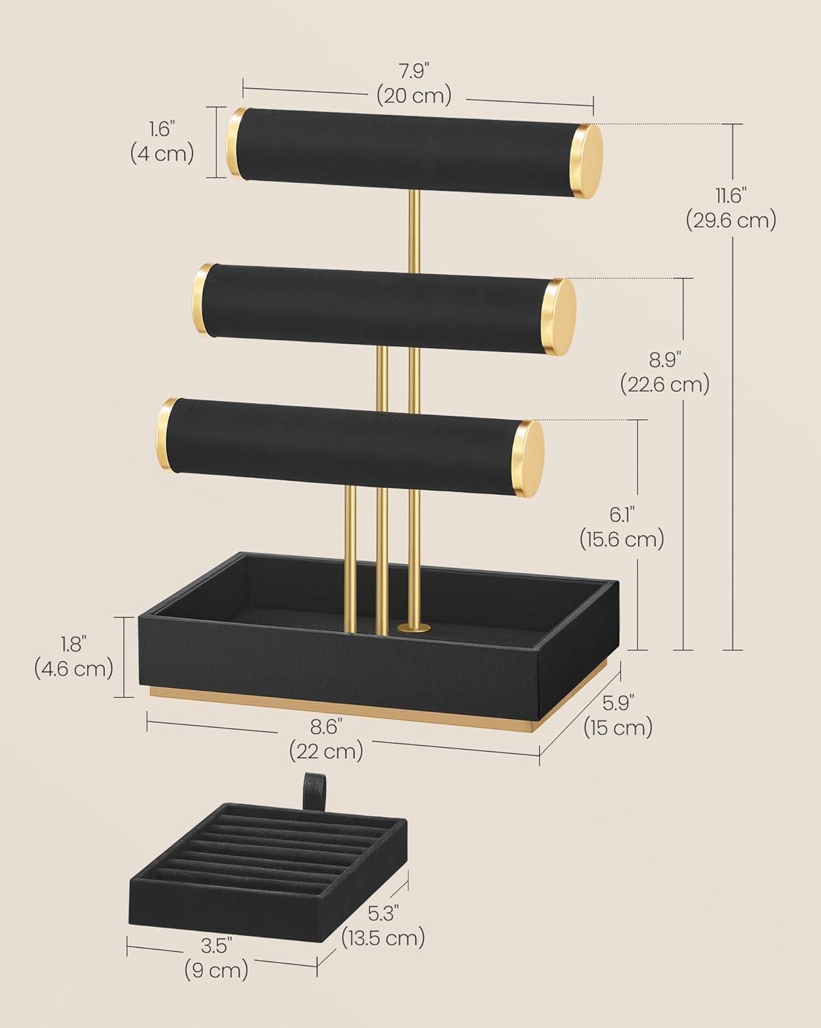 Ample Display Space with 5 Sections: 3 bracelet rods, including one tall rod specifically designed for long necklaces, plus a roomy tray and a ring holder keep your various jewels neatly displayed. The thoughtful spacing between the rods prevents tangling