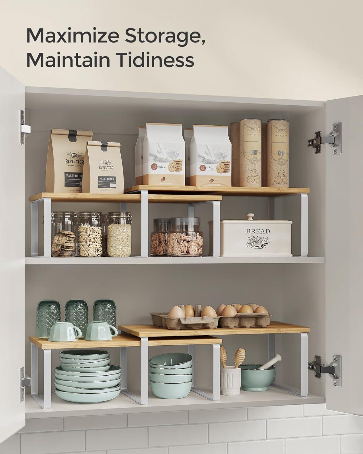 [Adjustable] With their unique design, with one slightly smaller than the other, these shelf organizers can be stacked on top of one another, nested, used separately, or even in an L-shape. Adjust them how you want to perfectly fit your kitchen space