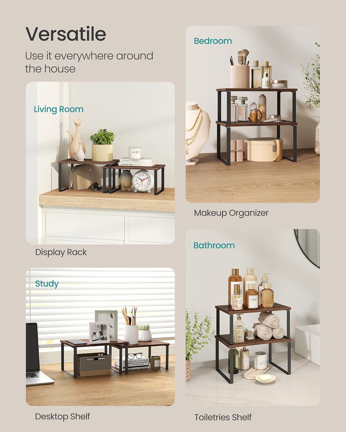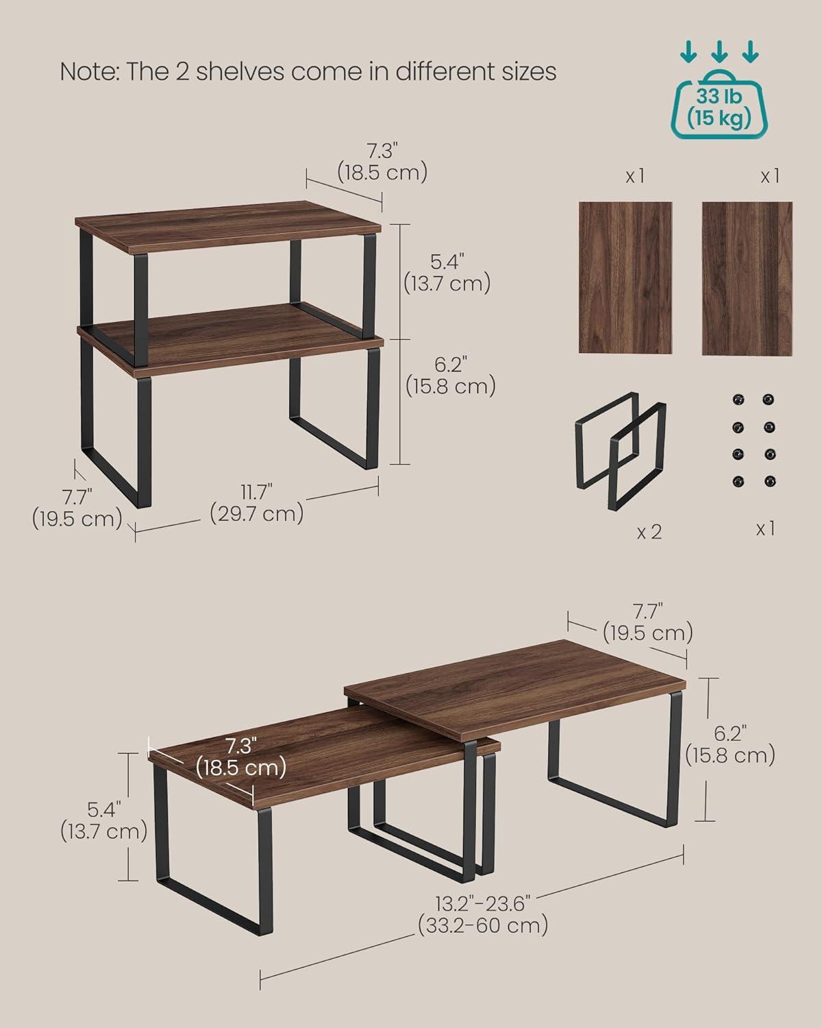 SONGMICS Cabinet Organizer Shelf, Set of 2 Kitchen Counter Shelves, Kitchen Storage, Spice Rack, Stackable, Expandable, Metal and Engineered Wood, Ink Black and Natural Beige UKCS02NB(Natural Walnut + Matte Black)