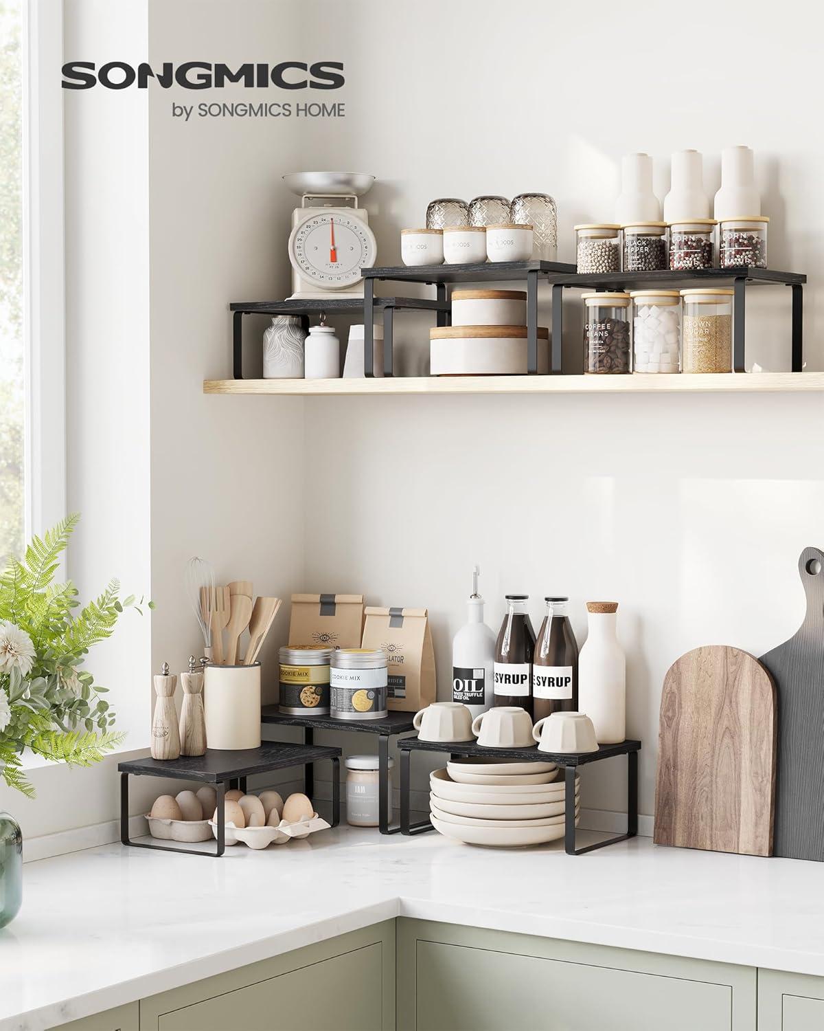 【STURDY AND DURABLE】Crafted from premium engineered wood and metal, these shelf organizers offer a robust construction. With a max. load capacity of 16.5 lb per spice rack, your kitchen essentials are securely stored
