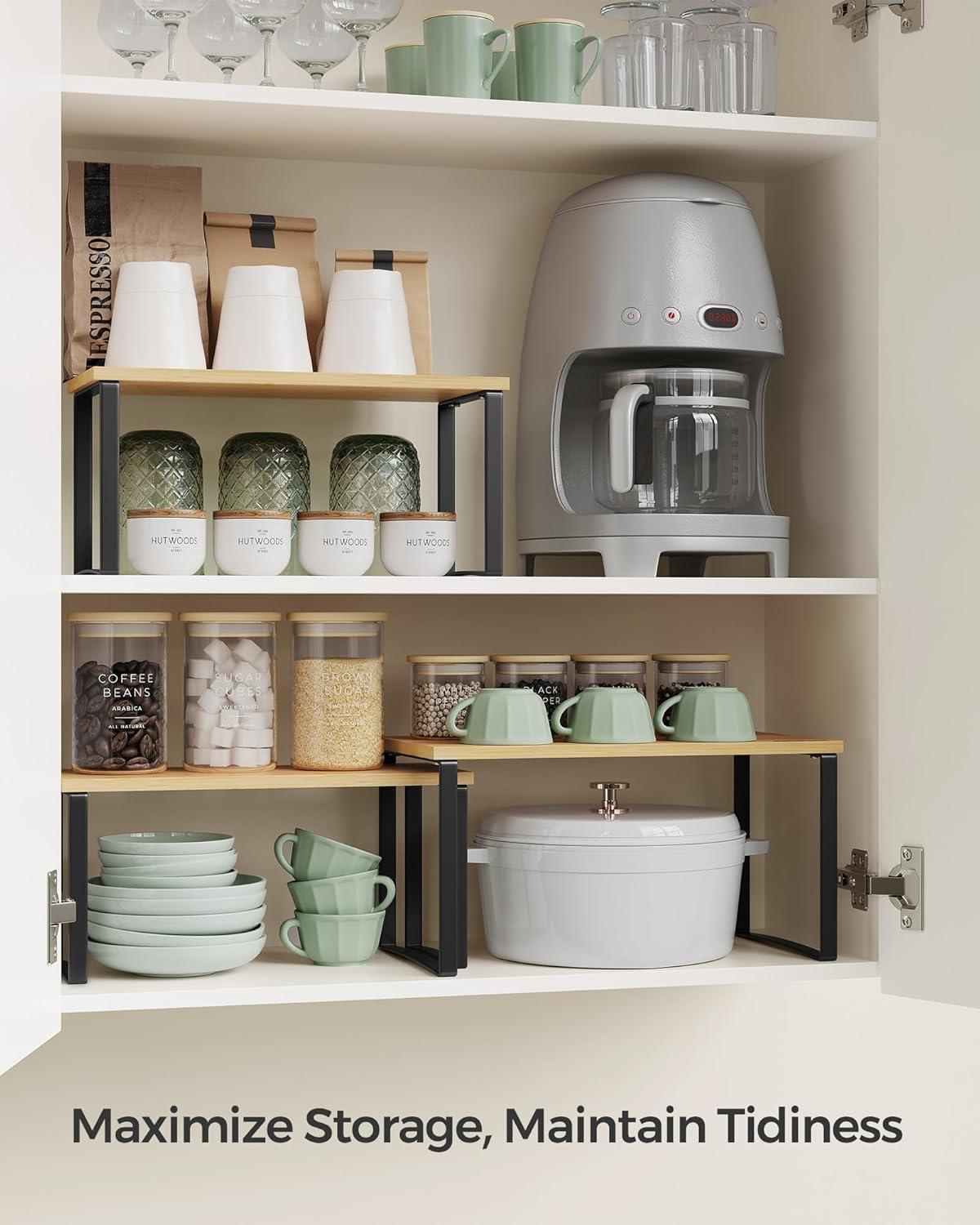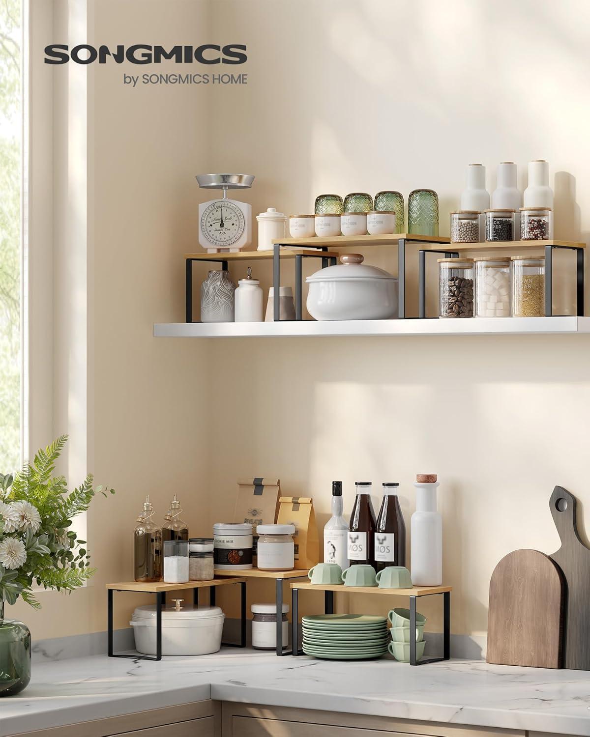 SONGMICS Cabinet Organizer Shelf, Set of 3 Kitchen Counter Shelves, Kitchen Storage, Spice Rack, Stackable, Expandable, Ink Black and Natural Beige UKCS014B01(Ink Black + Natural Beige)