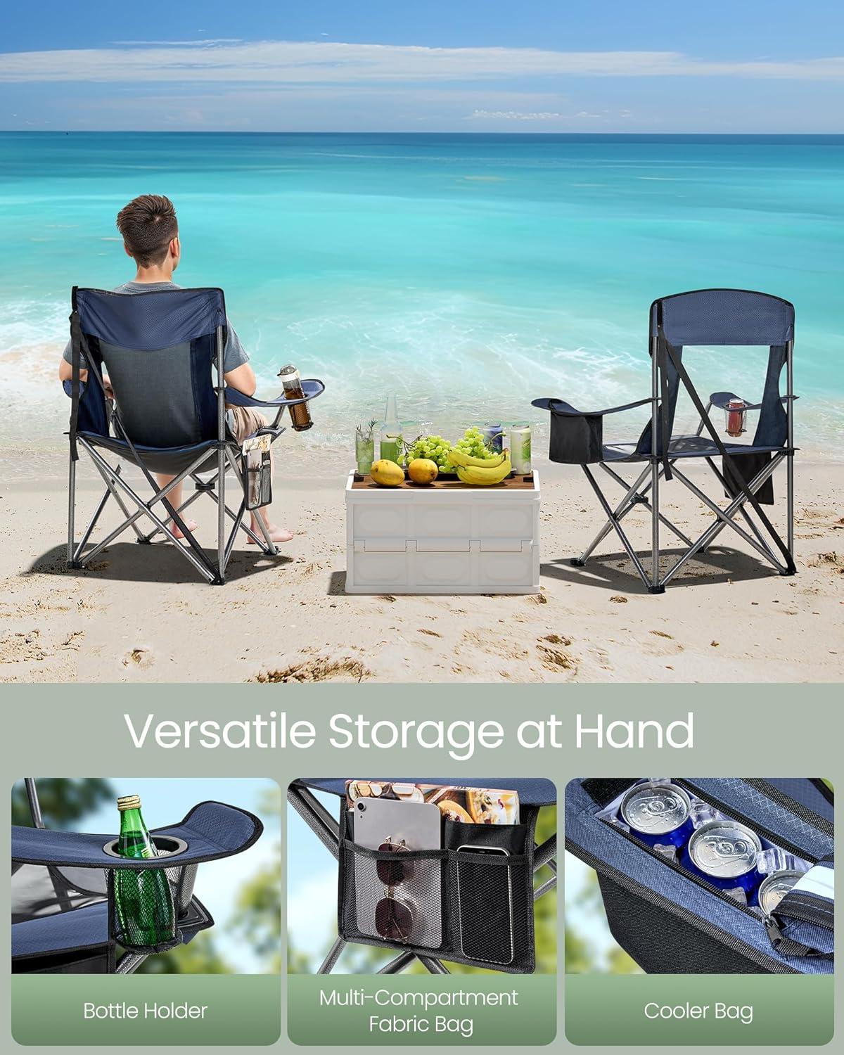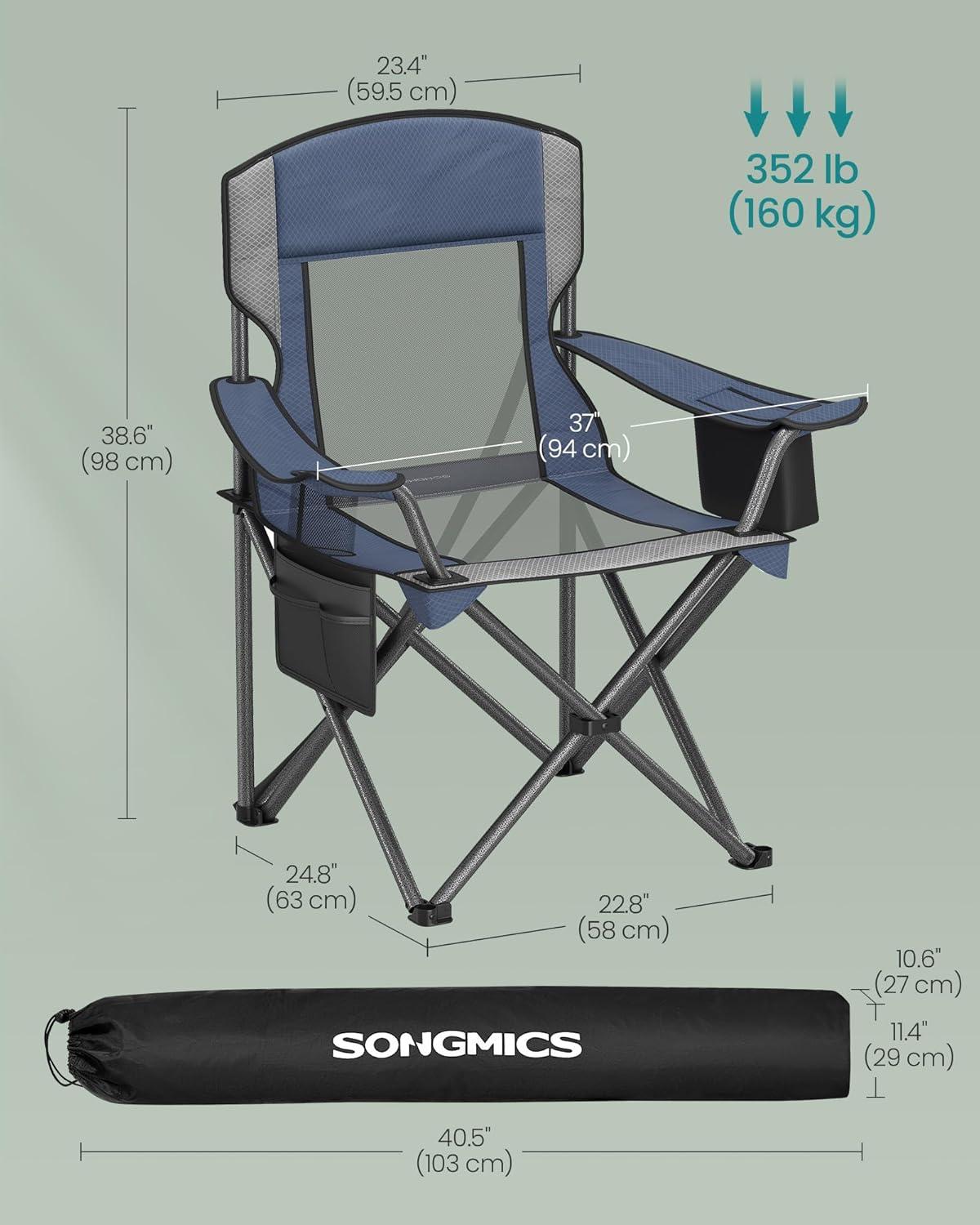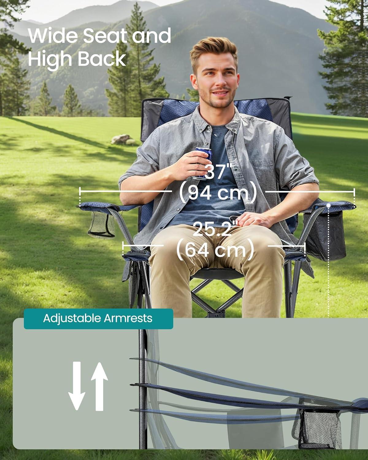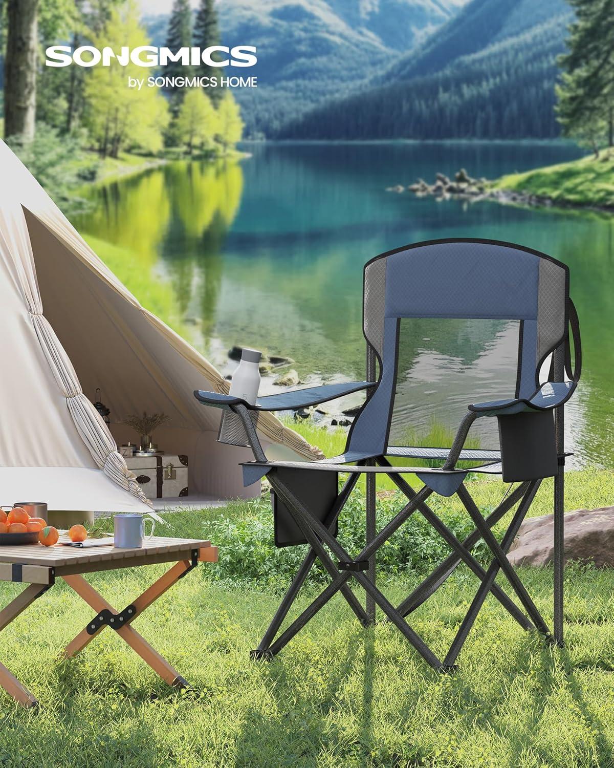 SONGMICS Camping Chair, Folding Oversized Chair, Comfortable and Heavy-Duty, 352 lb Weight Capacity, Adjustable Armrests with Cooler Bag, Storage Bag, Breathable Mesh, Bijou Blue UGCB060Q01(Ink Black)