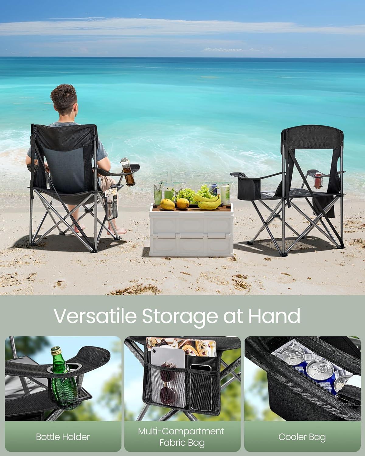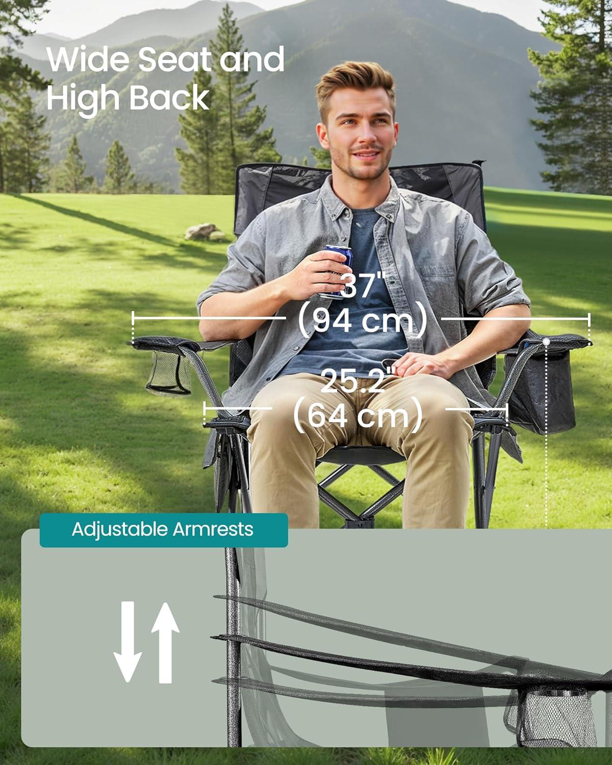 【SINK IN COMFORT】Experience superior comfort with a high back and a 25.2″ wide seat. The height-adjustable armrests offer comfortable positions for your arms, making this camping chair perfect for extended outdoor relaxation