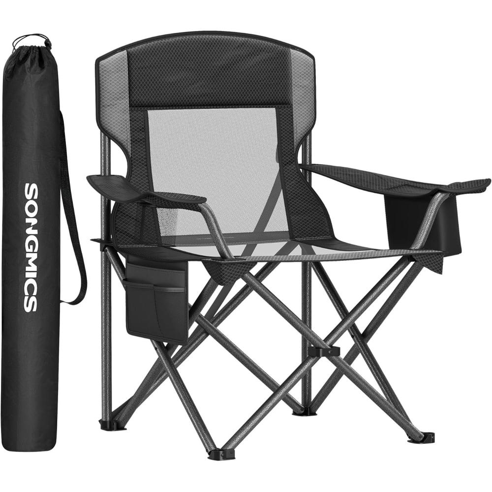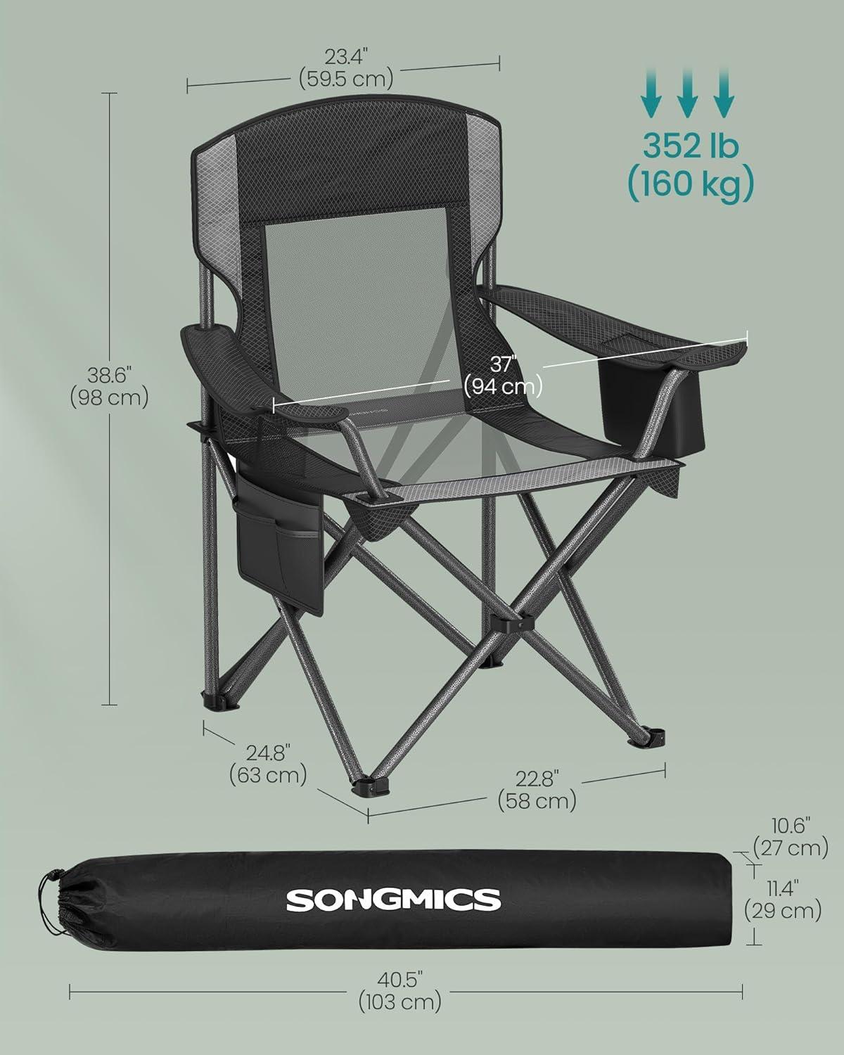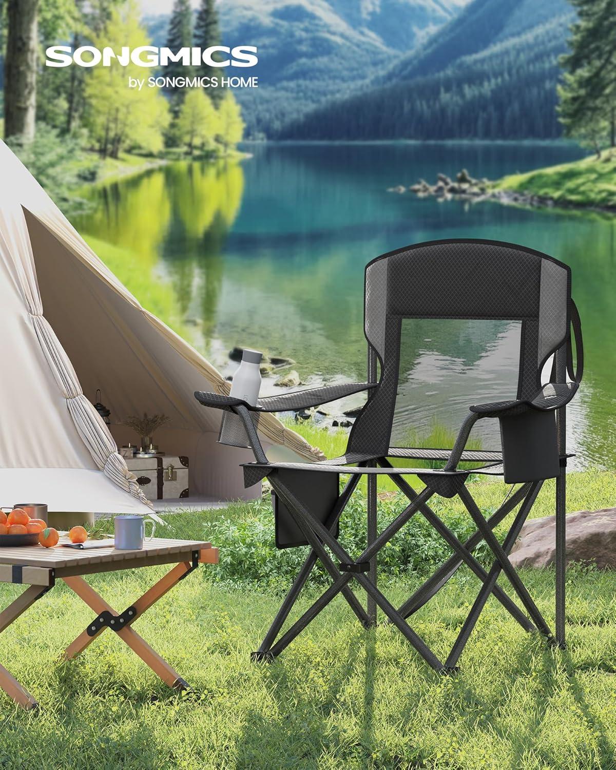 SONGMICS Camping Chair, Folding Oversized Chair, Comfortable and Heavy-Duty, 352 lb Weight Capacity, Adjustable Armrests with Cooler Bag, Storage Bag, Breathable Mesh, Bijou Blue UGCB060Q01(Ink Black)