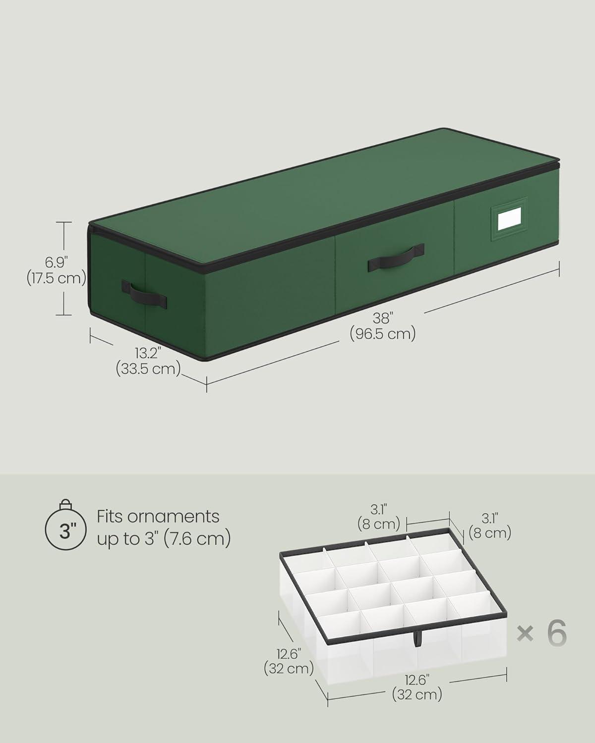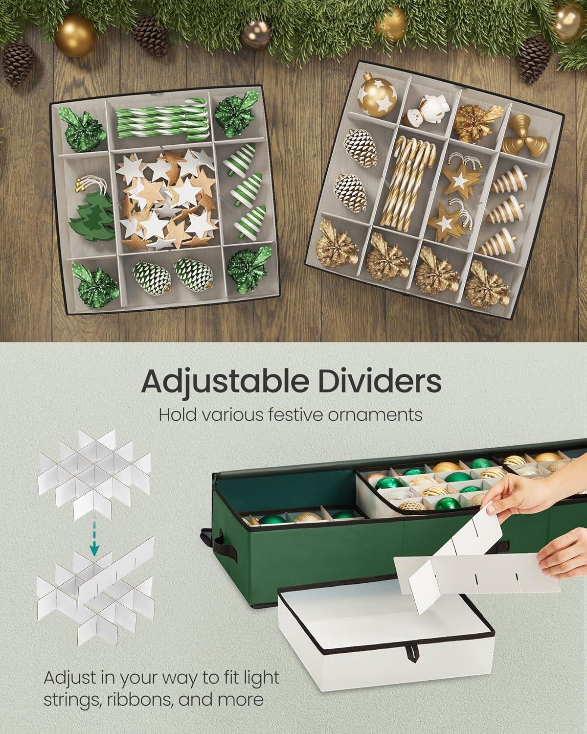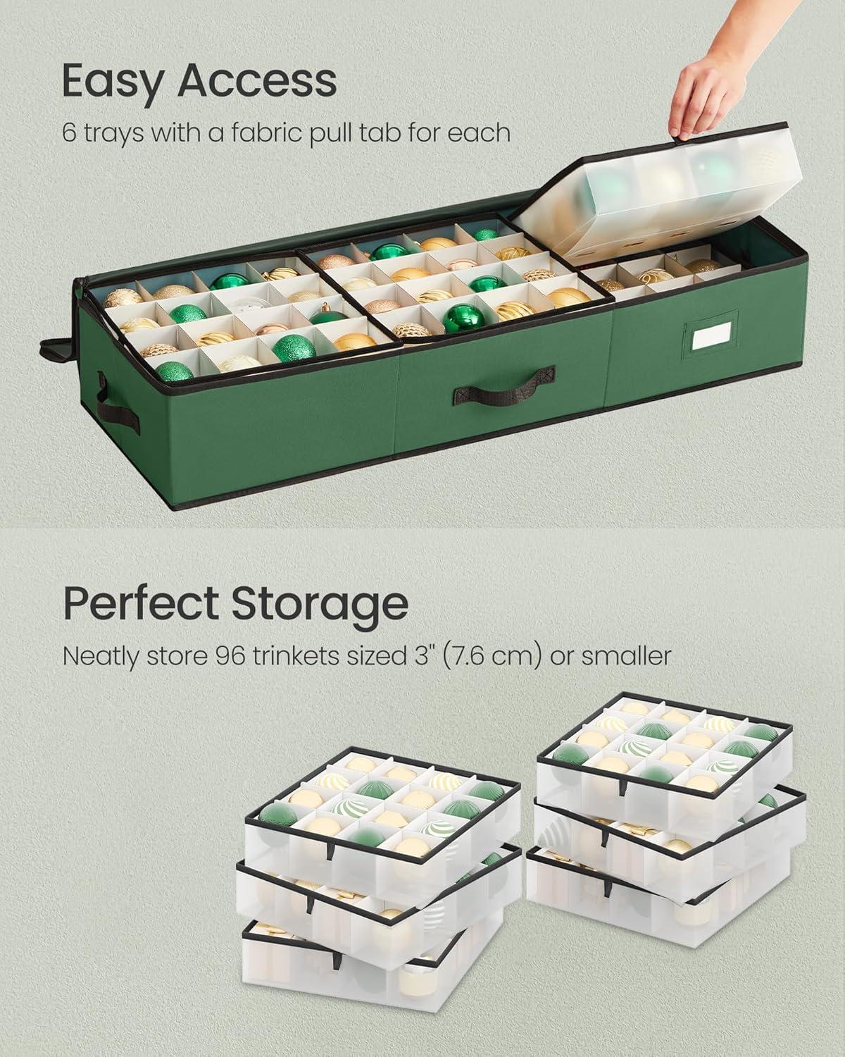 【EASY ACCESS, FLEXIBLE STORAGE】Access your decorations with the fabric pull tabs on the 6 trays. Customize your storage with adjustable dividers in the compartments to fit baubles, pinecones, or bells
