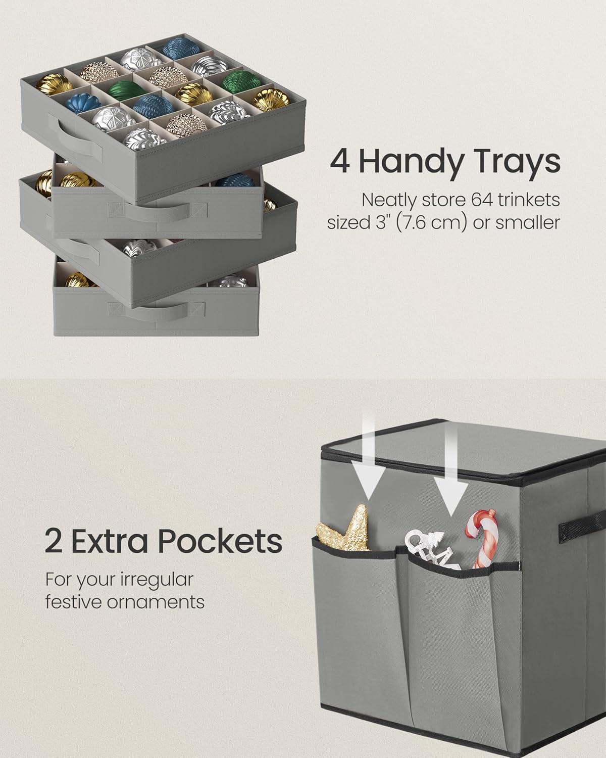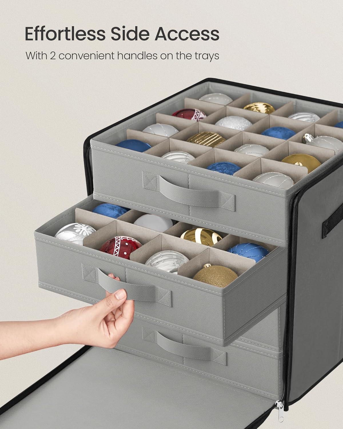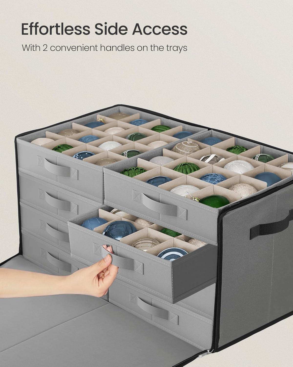 SONGMICS Christmas Ornament Storage Box, with Side Open, Stackable Christmas Storage Container with Lid, 4 Drawer Trays, 600D Oxford, 3-Inch 64 Slots, Cherry Red URFB037R01(Dove Gray)