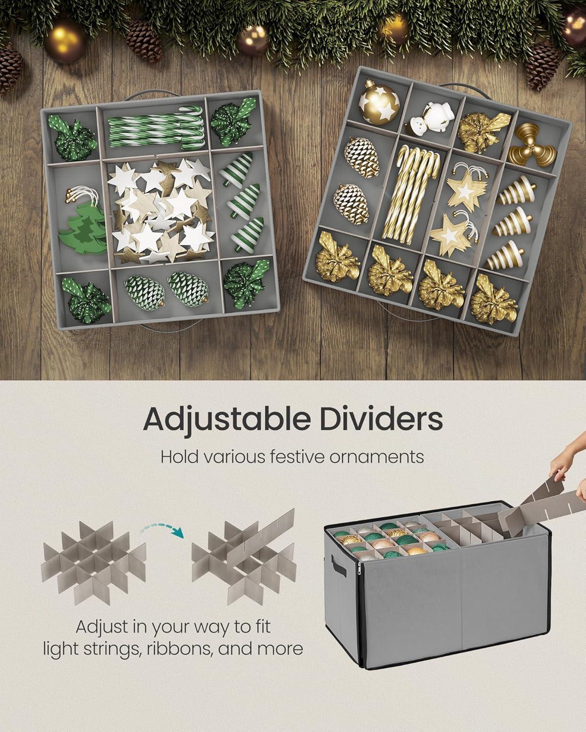 [Secure and Portable] Dual zippers keep dust out, ensuring items in the Christmas ornament storage box stay in perfect condition. The lid prevents accidental openings for added safety, and 2 side handles provide easy mobility