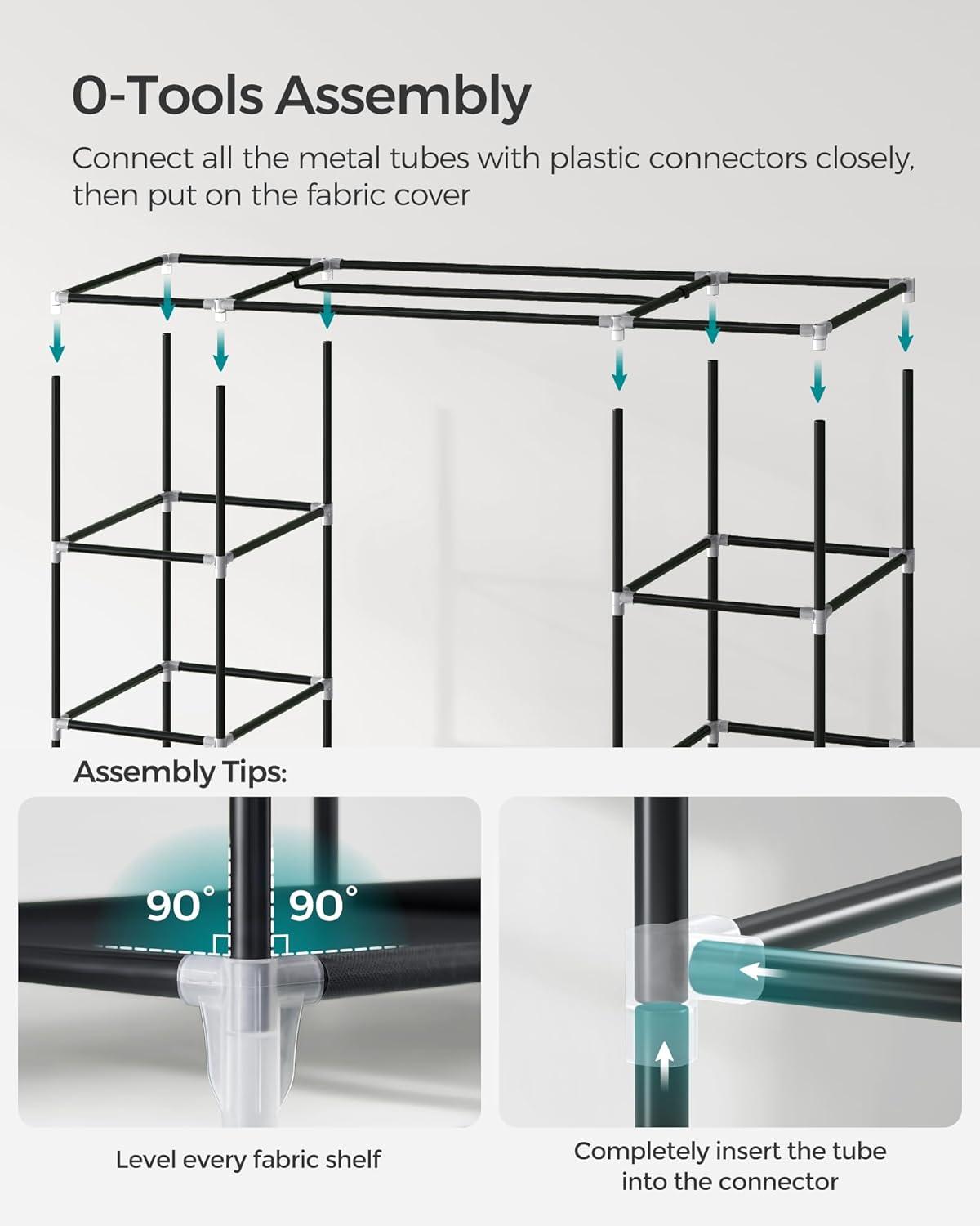[Easy Assembly] No tools required. Just follow the instructions and insert the tubes into the plastic connectors, then you can finish the assembly of this clothes storage organizer effortlessly. Also, spare parts are provided for replacement
