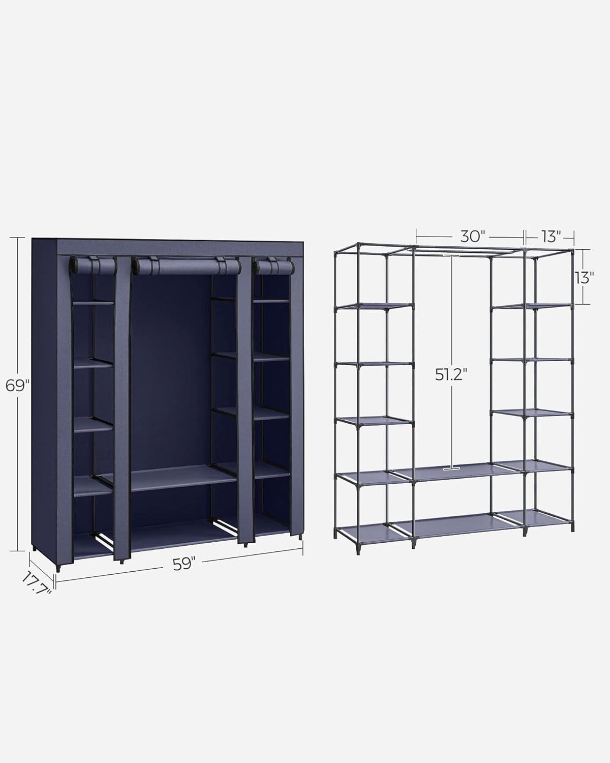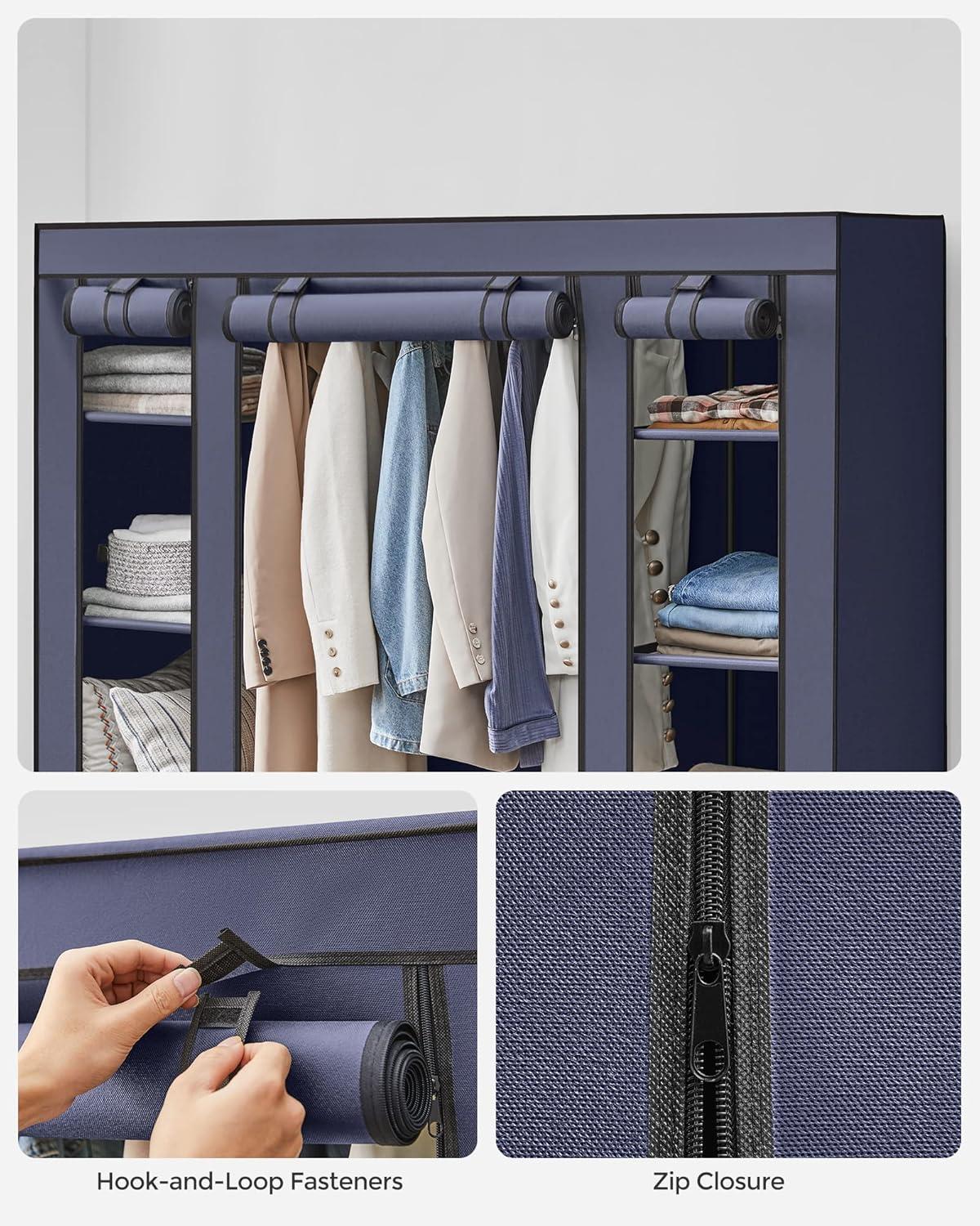 [Strength to Support] With 0.6-inch dia. metal tubes and 120 g/m² non-woven fabric, this wardrobe will assure its sturdiness and durability. The hanging rail holds up to 33 lb and each shelf 11 lb