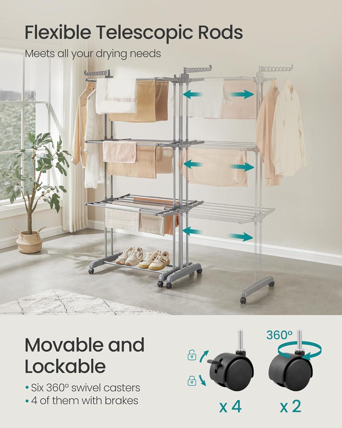 [Sturdy and Durable] This clothes airer is made from heavy-duty stainless steel and thick plastic, with reinforced double rods on both sides. It's sturdier than your average drying rack and boasts a longer lifespan, capable of supporting up to 77 lb