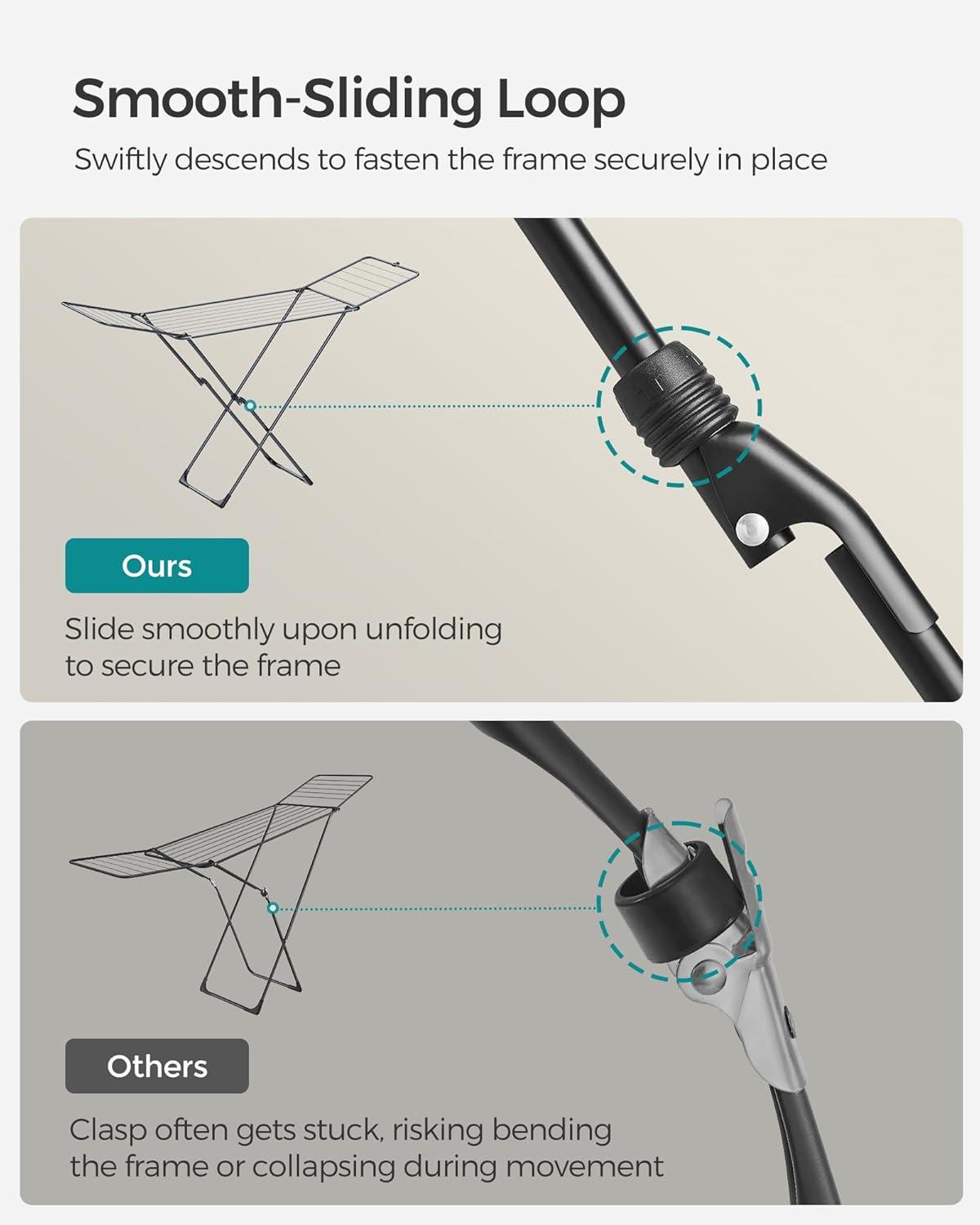 [Thoughtful Details] This drying rack features a smooth-sliding loop, a plastic clip that keeps wings securely in place when folded, and floor-friendly plastic feet