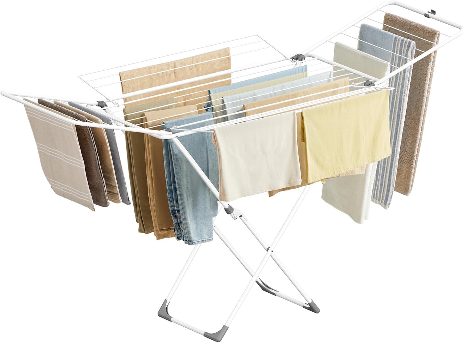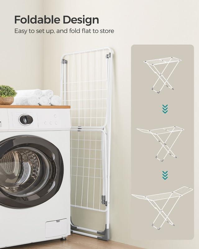 SONGMICS Clothes Drying Rack, Metal Laundry Drying Rack, Foldable, Space-Saving, Free-Standing Airer, with 2 Gullwings, Indoor Outdoor Use, Bed Linen Clothing, White ULLR540W01(White)