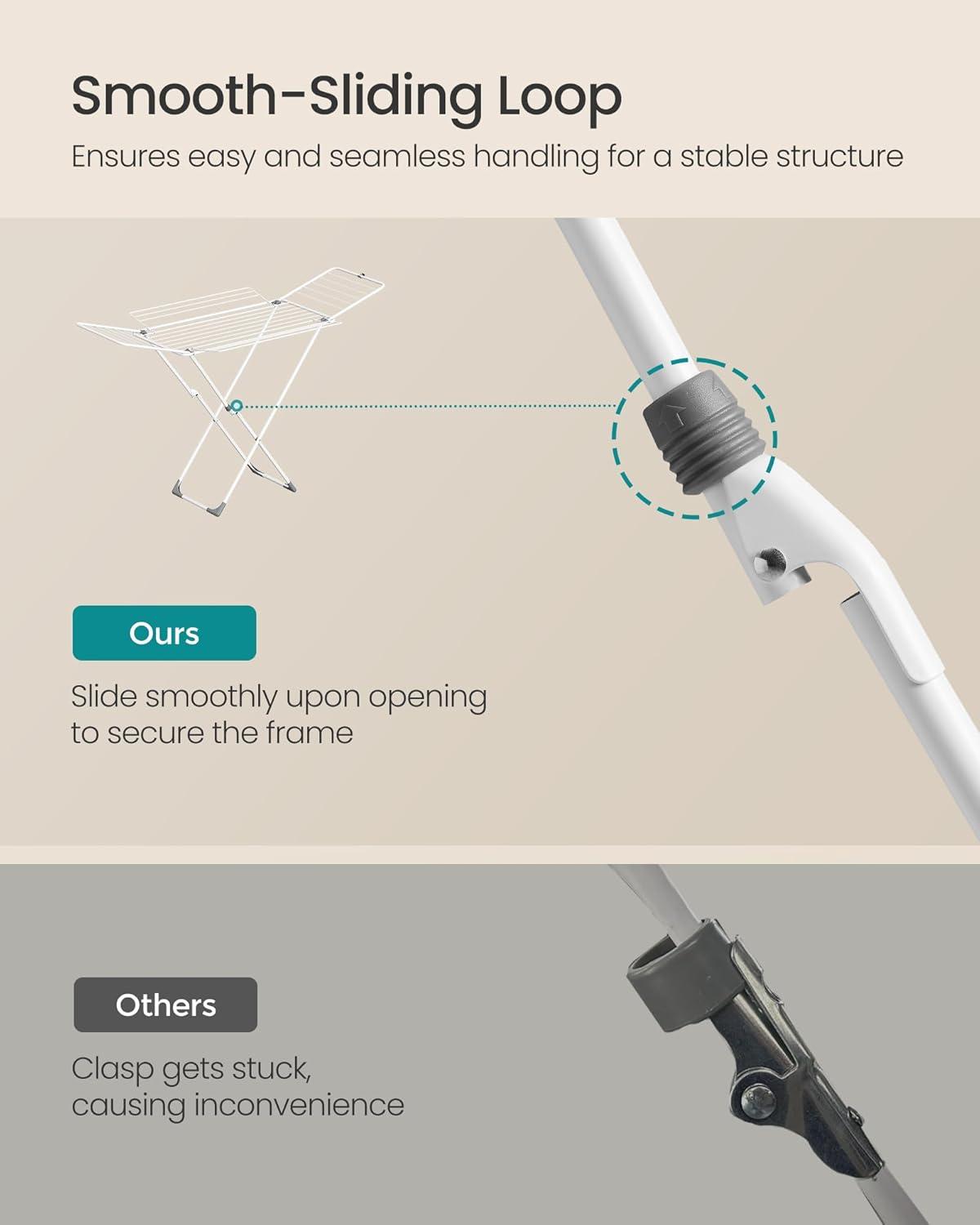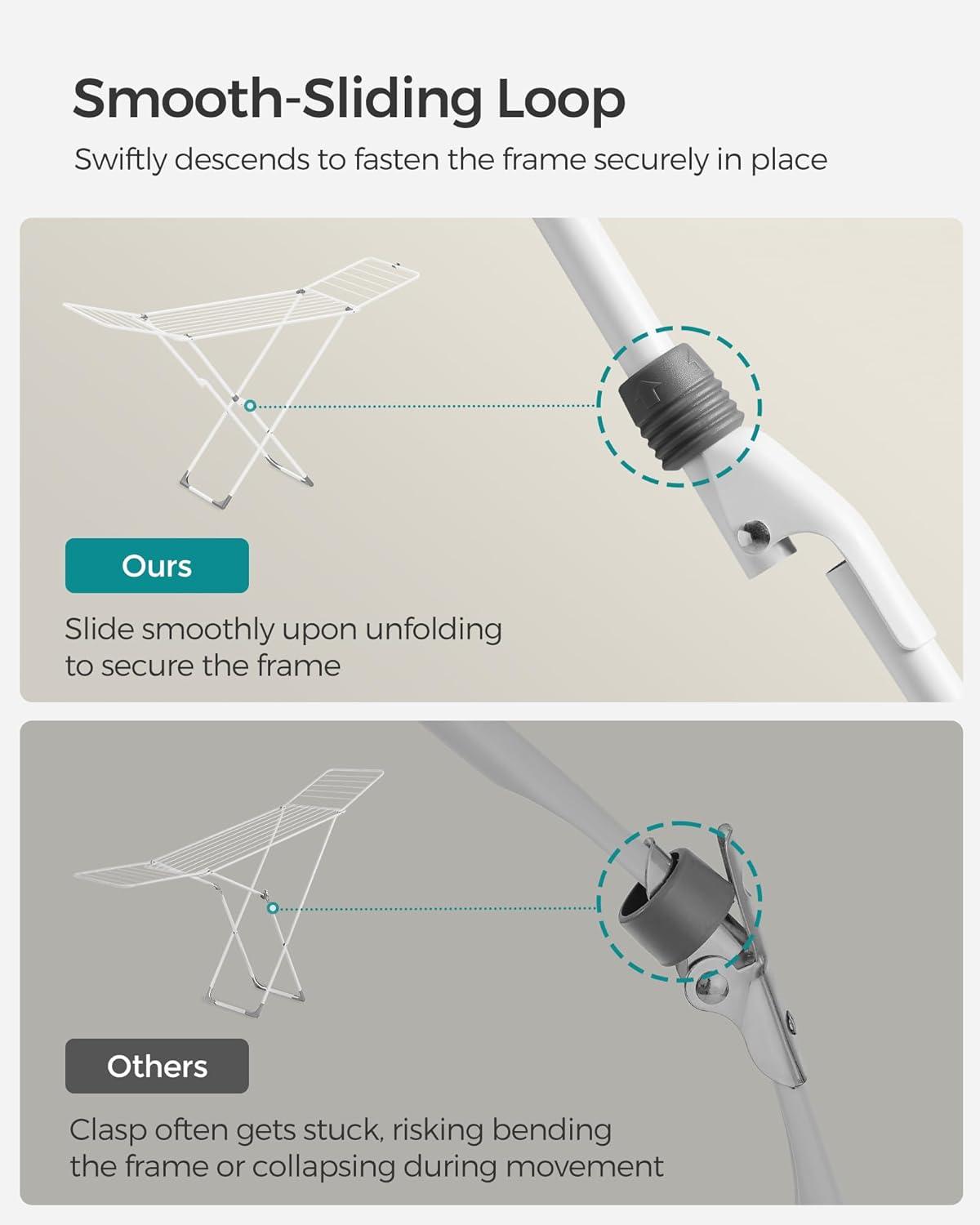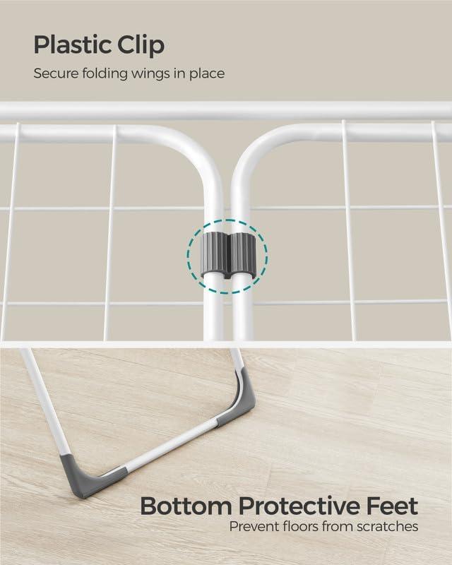 [Thoughtful Details] This drying rack features a smooth-sliding loop, a plastic clip that keeps wings securely in place when folded, and floor-friendly plastic feet