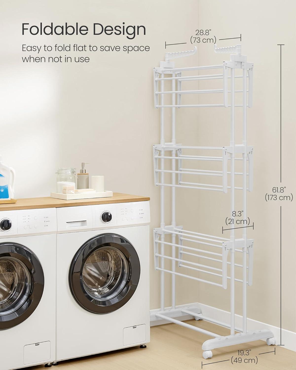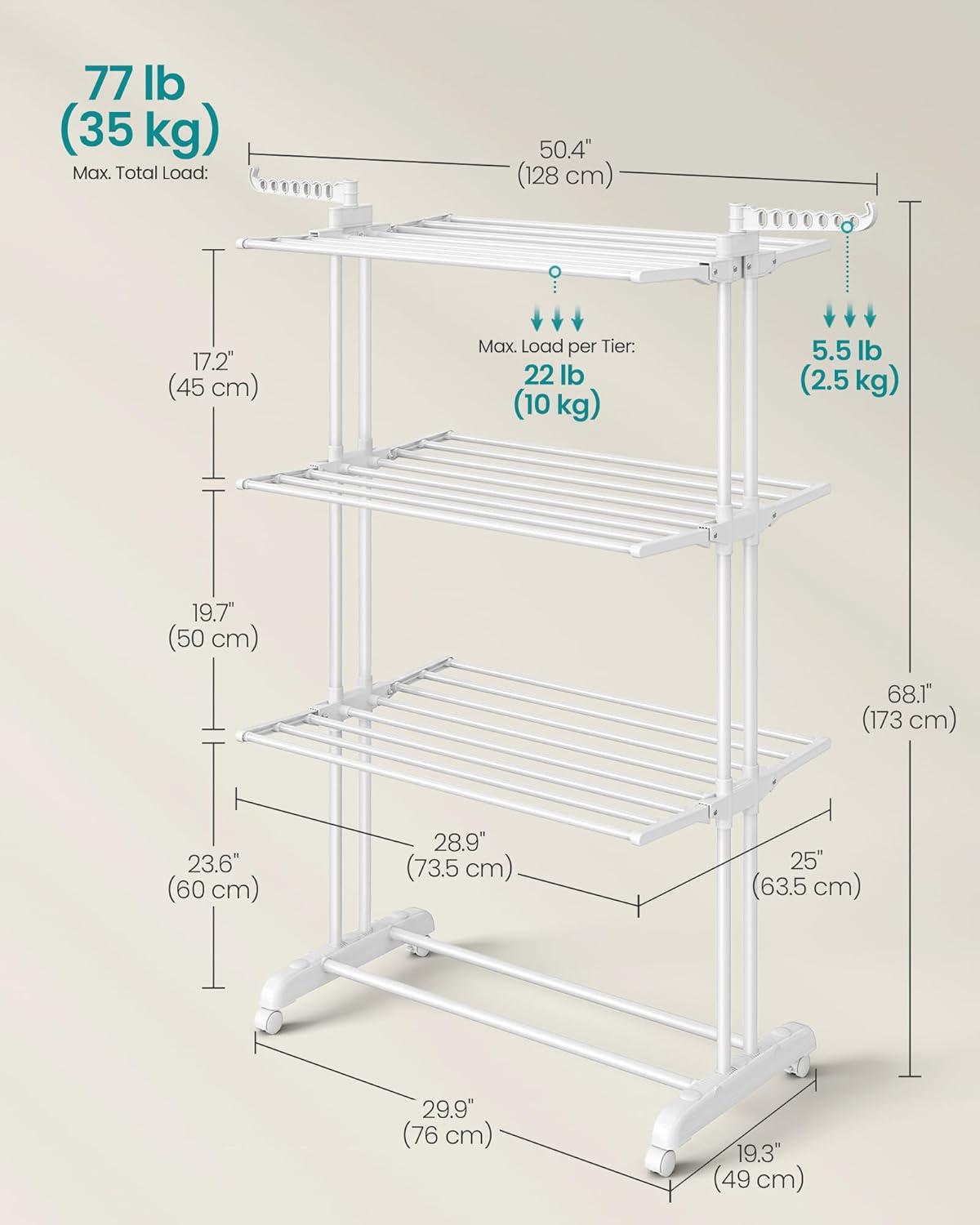 Large Capacity This 4 tier, 25.2″D x 49.6″W x 68.1″H drying rack features 3 top tiers, 2 rotating wings with 14 slots, and a bottom tier for shoes. It's your all in one solution for drying everything from socks and towels to family outfits and blankets