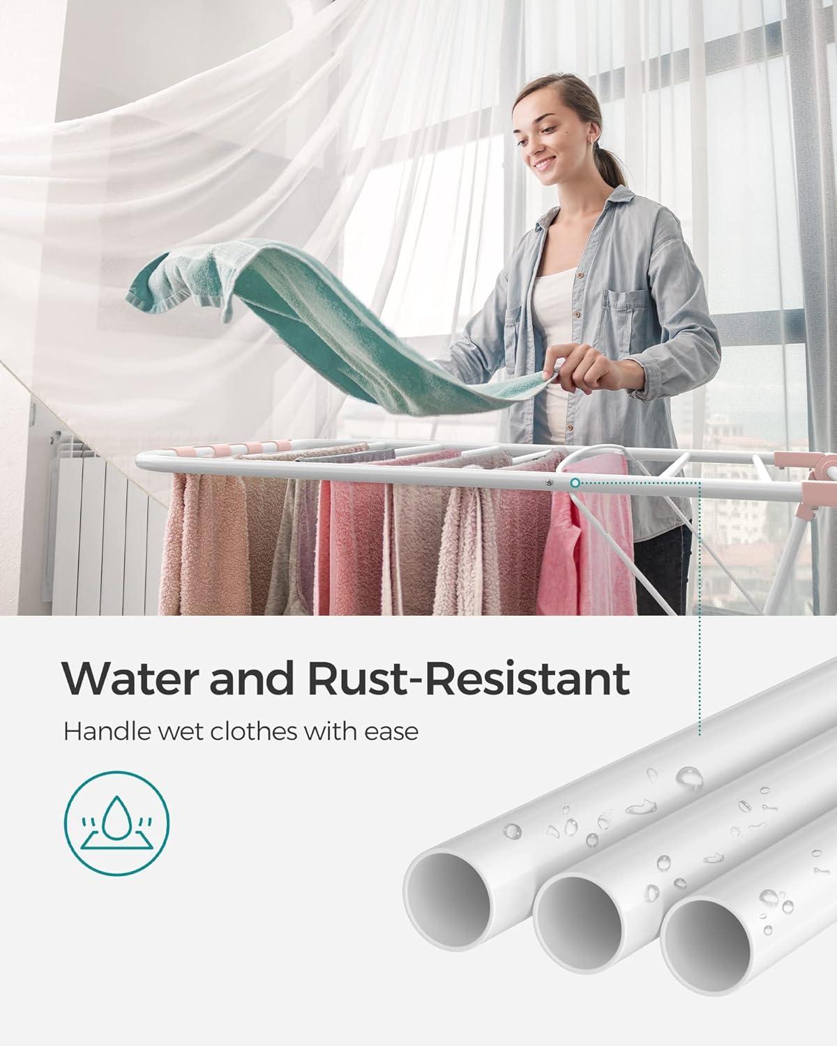 [Rust-Resistant & Heavy-Duty] Boasting thick steel tubes with a specially treated finish and durable plastic connectors, this clothes drying rack is capable of holding up to 55 lb. You won't have to worry about it buckling or rusting over time