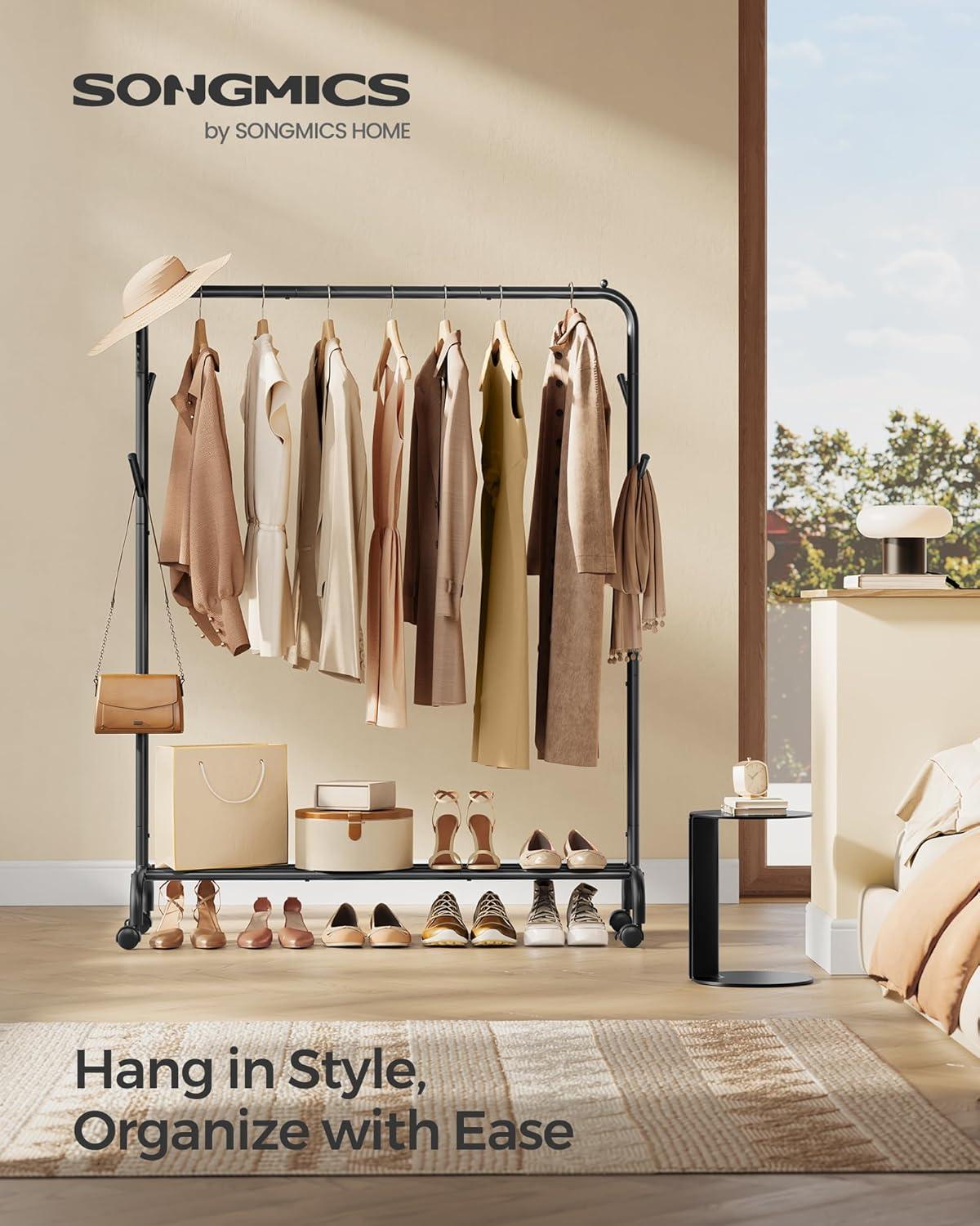 【VERSATILE STORAGE】With a high rail and a low rail for hanging clothes of different lengths, hooks on both sides for bags and hats, and a bottom shelf for boxes and shoes, this clothes rack keeps all your essentials in one place