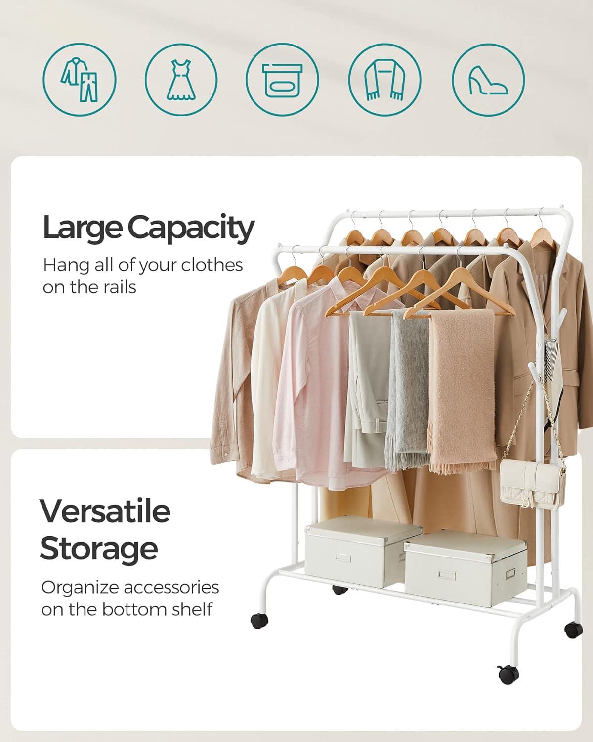 【QUICK DRYING & EASY ACCESS】 The 16.5″ spacing between 2 clothes hanging rails allows air to easily flow through, promoting quick drying. It offers ample hanging area to prevent crowded, messy clothes, making them easier to access
