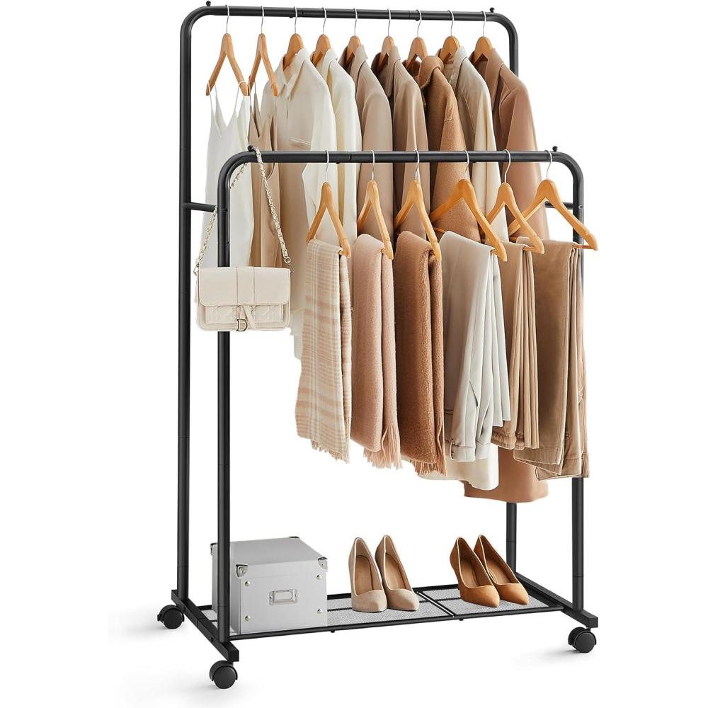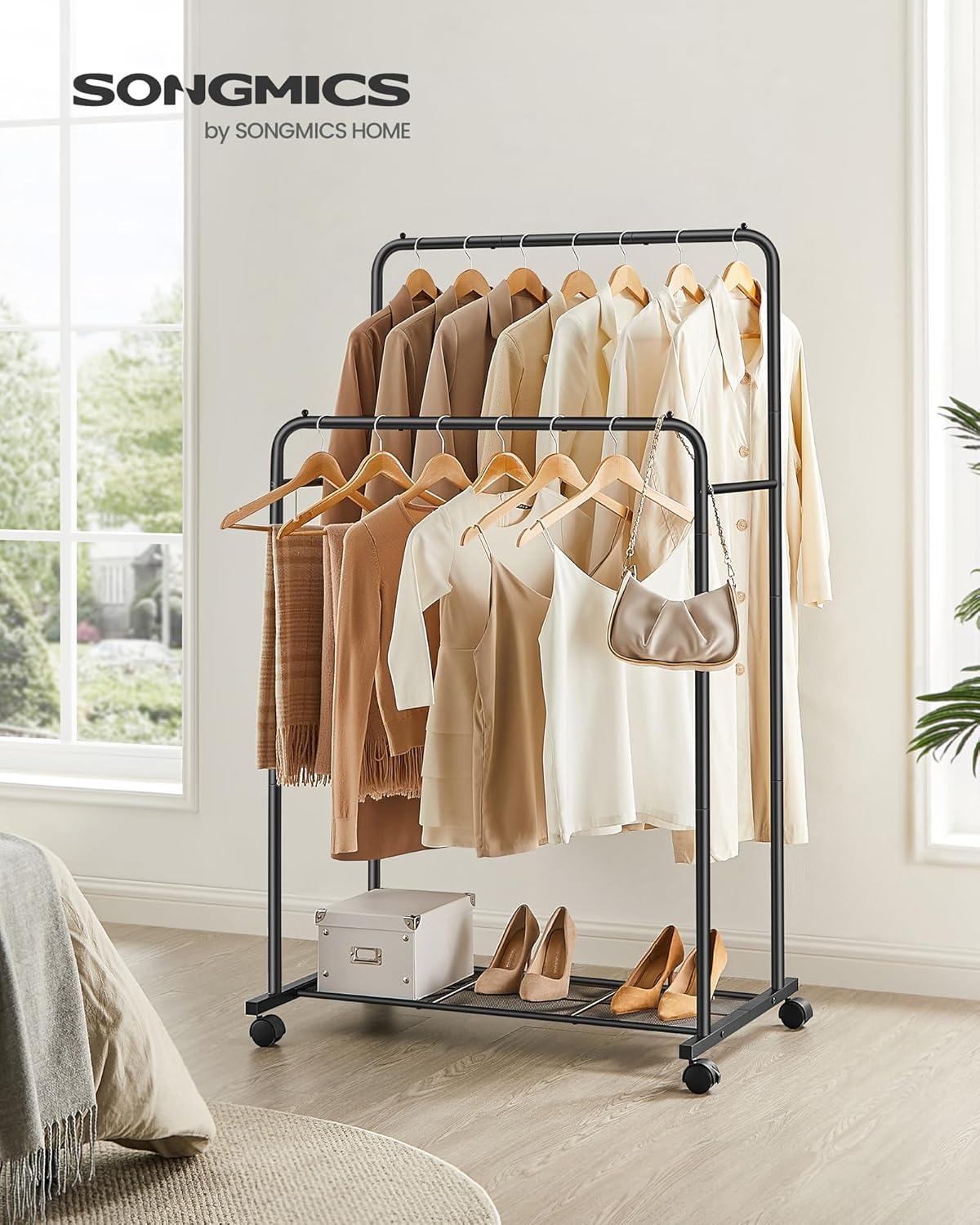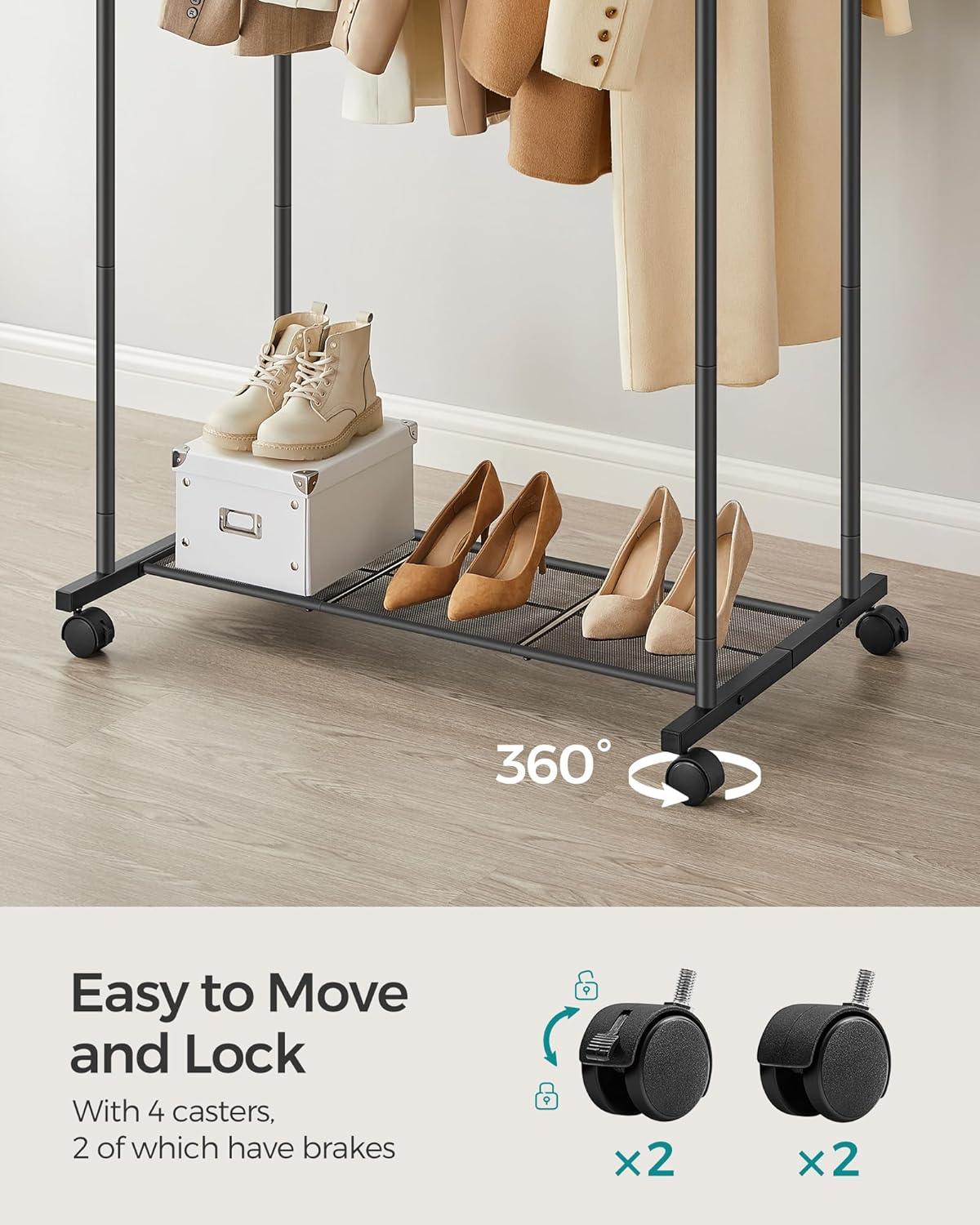 [Easy to Move] 4 universal casters, including 2 with brakes, make it easy for you to move this garment rack from your bedroom to your coatroom and lock it in place as you need