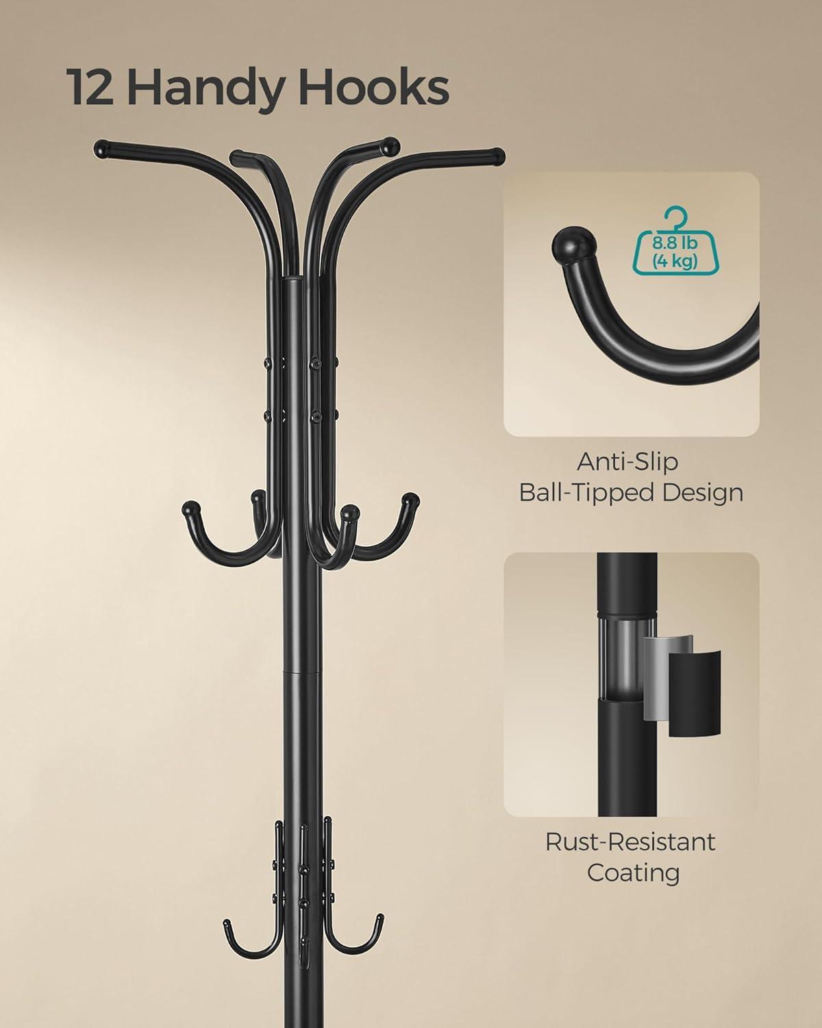 [Hang with Ease] With 4 sturdy legs and a low, stable center of gravity, this coat rack allows you to confidently hang heavier coats and bags on 12 robust hooks (each hook holds up to 8.8 lb), ensuring your items stay securely in place