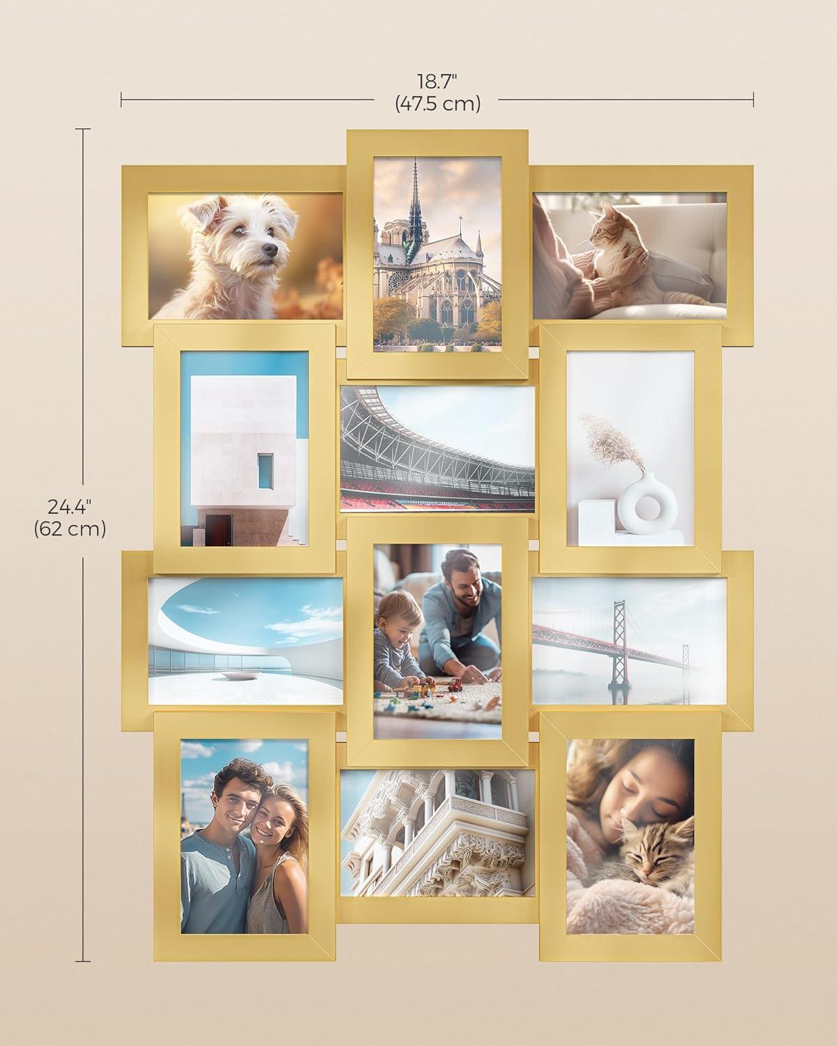 SONGMICS Collage Picture Frames, 4x6 for Wall Decor Set of 12, Multi Family Photo for Gallery Decor, Hanging Display, Assembly Required, Rustic Brown(Pale Gold)