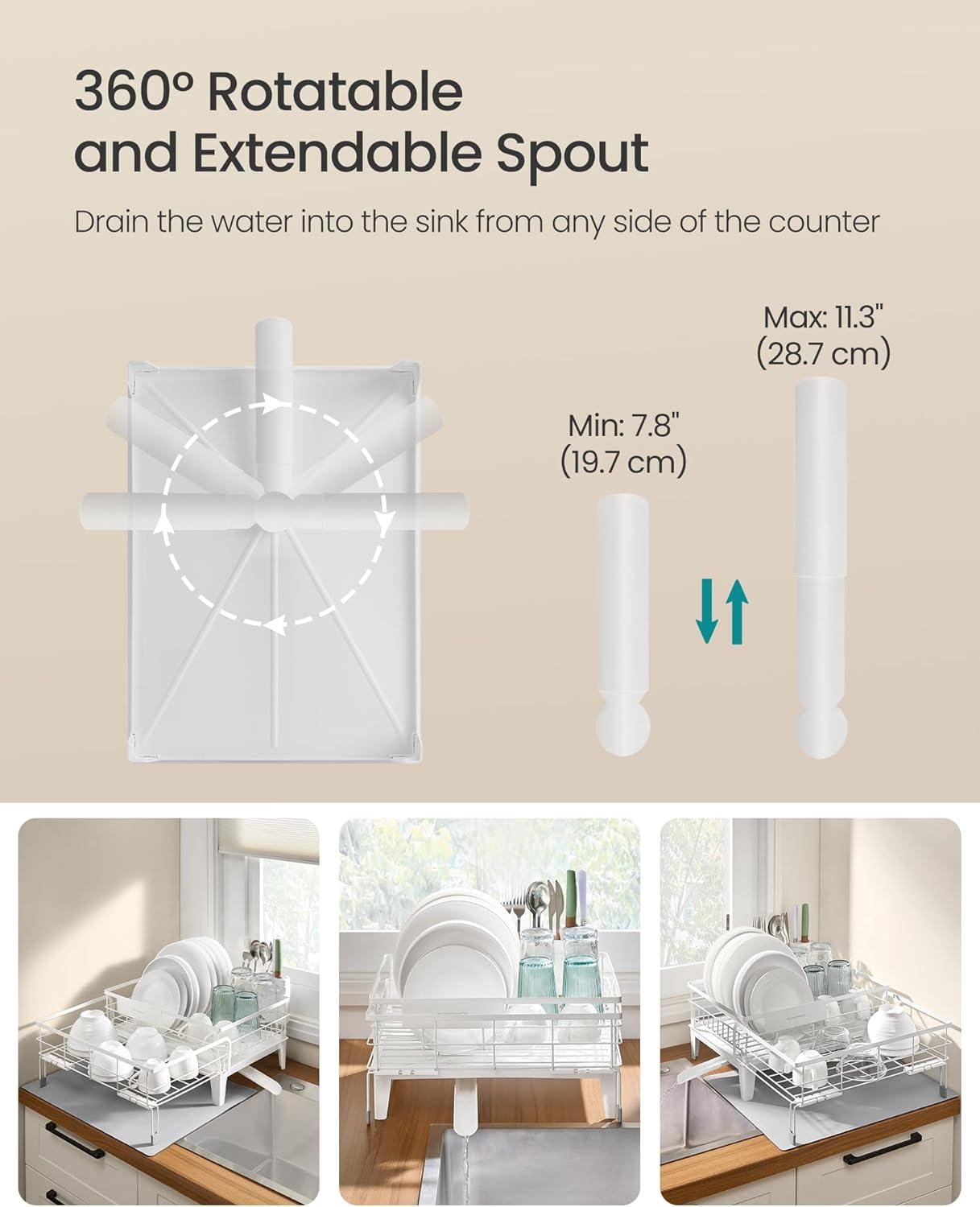 Efficient Drainage: The dish rack features a 360° rotatable and extendable spout, ensuring water can flow into the sink from any direction. The sloped drainboard allows for quick drainage, while the cutlery holder also directs water to the drainboard